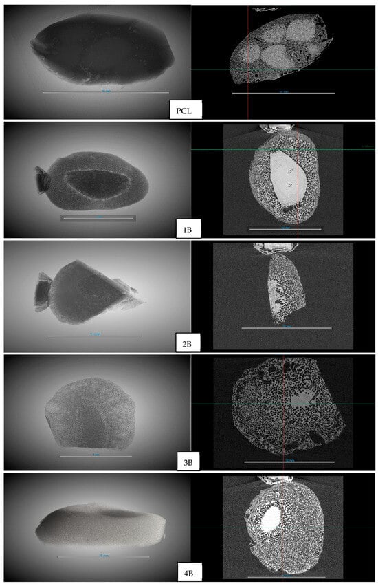 The SEM analysis (Figure 6) revealed notable differences in the porous morphology between the pretreated samples (1B, 2B, 3B, and 4B) and the untreated PCL scaffold. The hydrothermally treated samples exhibit a higher number of pores that were distributed more homogeneously throughout the structure compared to the untreated PCL, which presented a less defined and more irregular pore distribution. Additionally, the pretreated scaffolds displayed a more ordered architecture, suggesting an enhanced control over the foaming process due to the hydrothermal step. This structural organization hints at a potentially higher degree of pore interconnectivity, which was further examined in the following part through X-ray microtomography analysis.