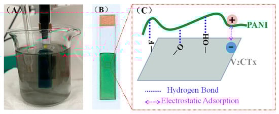 (A) Digital photograph of the PANI/V2CTx composite film undergoing electrodeposition in electrolyte containing V2CTx, (B) digital photograph of the PANI/V2CTx composite film on ITO/glass, and (C) schematic illustration of hydrogen bond and/or electrostatic adsorption between V2CTx and PANI in the PANI/V2CTx composite films.