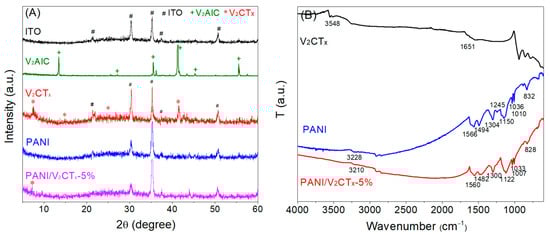 (A) X-ray diffraction (XRD) patterns of ITO/glass, V2AlC, V2CTx, PANI film and PANI/V2CTx-5% film and (B) FTIR spectra of V2CTx, PANI film and PANI/V2CTx-5% film.