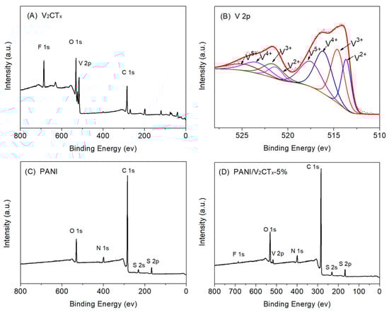 X-ray photoelectron spectroscopy (XPS) analysis was used to analyze the surface elemental composition and chemical states of the samples. Figure 3 shows the survey spectra of V2CTx, PANI, and PANI/V2CTx-5% films and the V 2p high-resolution scan of V2CTx. Apart from V and C, the XPS spectrum of V2CTx (Figure 3A) also shows the presence of F and O, which demonstrates that many F- and O-containing groups exist on the surface of V2CTx, which can endow V2CTx with unique properties, such as hydrophilicity, reactivity, electronegativity, etc. The V 2p high-resolution spectrum (Figure 3B) is composed of a spin–orbit doublet attributed to the V 2p1/2 and V 2p3/2 states. There are four deconvoluted peaks in the range of 510 to 528 eV, which are ascribed to V2+ (513.6 eV for V 2p3/2, 521.3 eV for V 2p1/2), V3+ (514.6 eV and 522.0 eV), V4+ (516.1 eV and 523.4 eV), and V5+ (517.5 eV and 524.8 eV) []. Figure 3C displays the existence of C, O, N, and S in the film, indicating the formation of DBSA-doped PANI. The survey spectrum of the PANI/V2CTx-5% composite film (Figure 3D) indicates the coexistence of PANI and V2CTx. The above analysis of the XPS spectra can further confirm that the PANI/V2CTx composite films were successfully prepared using the electrodeposition method.