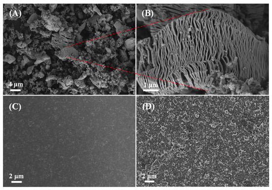 The Scanning electron microscopy was utilized to investigate the structure and morphology of the samples. Figure 4 displays the FESEM images of V2CTx, the PANI film and the PANI/V2CTx-5% film. As shown in Figure 4A,B, the V2CTx exhibits a characteristic accordion shape, indicating the successful completion of the etching process. According to Figure 4C, the pure PANI film shows a compact and dense morphology. In contrast, the PANI/V2CTx-5% composite film exhibits a porous and loose surface with the V2CTx interleaved into the PANI film uniformly and encapsulated by PANI matrices, as confirmed in Figure 4D. This change in morphology can be attributed to the existence of V2CTx, avoiding the dense stacking of PANI during electropolymerization via hydrogen bond or electrostatic interaction between PANI and V2CTx. V2CTx with a 2D layered structure and excellent electrical conductivity may contribute to forming an interconnected porous structure and conducting pathways for rapid ionic and electronic transport, a large specific area, and many active sites. Therefore, the unique morphological structure of the composite film will help to improve electrochemical performance [].