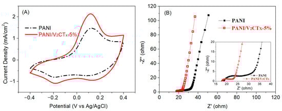 (A) CV curves of the PANI and PANI/V2CTx-5% films at a scan rate of 100 mV s−1 and (B) Nyquist plots of the PANI and PANI/V2CTx-5% films at frequency from 10 kHz to 10 mHz using a perturbation amplitude of 10 mV. The inset shows magnified Nyquist plots.