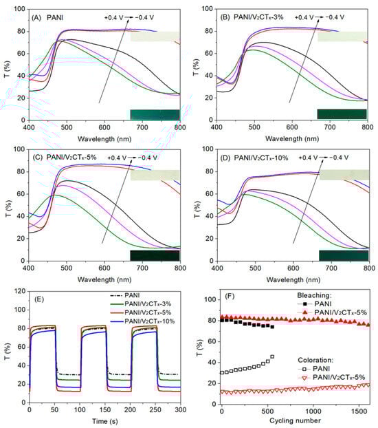 UV-Vis transmittance spectra of (A) PANI, (B) PANI/V2CTx-3%, (C) PANI/V2CTx-5% and (D) PANI/V2CTx-10% at different potentials; (E) dynamic switching curve comparison between PANI, PANI/V2CTx-3%, PANI/V2CTx-5% and PANI/V2CTx-10% at λ700nm (−0.4 V/+0.4 V, 100 s/cycle); and (F) cycling stability of PANI and PANI/V2CTx-5% (−0.4 V/+0.4 V, 40 s/cycle). Insets in (A–D) showing the digital photographs of the films electrodeposited on ITO/glass at bleached (upper, light greenish yellow) and colored state (lower, dark bluish green).