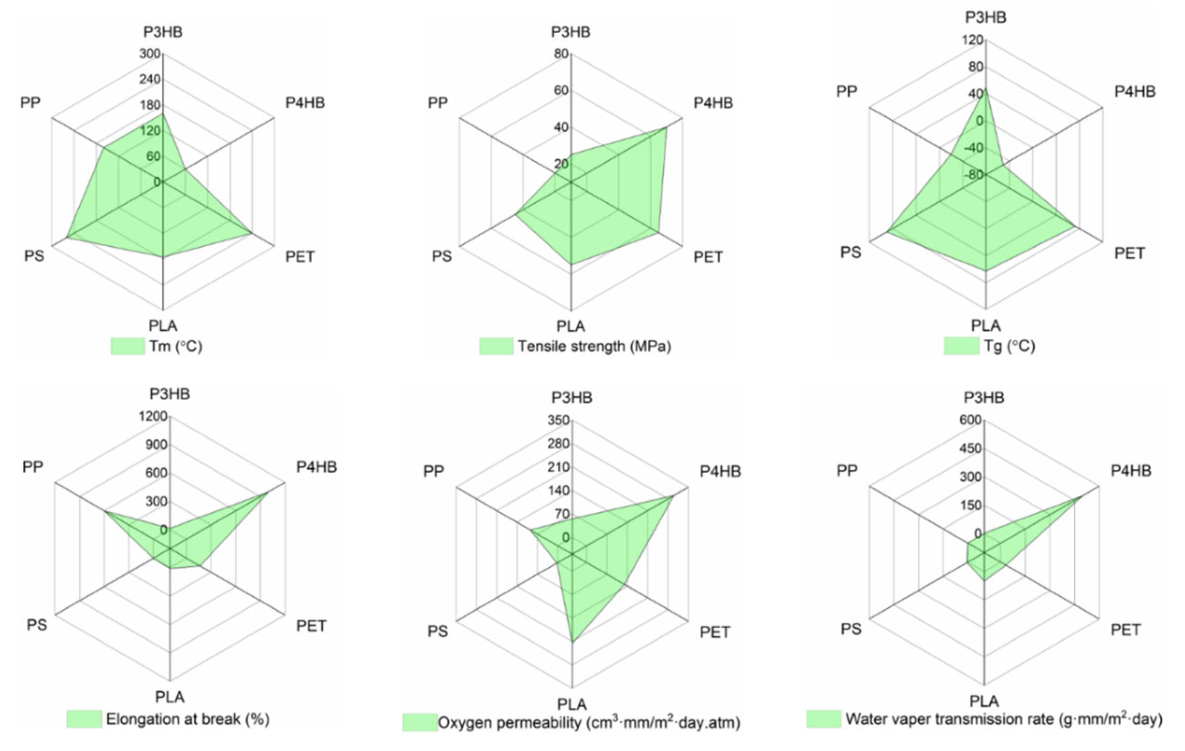 | PE/PHBV (80/20, 70/30) | 348.39 + 12.5 299.7 + 8.67 | 25.93 + 0.72 17.5 + 0.3 | - | Packaging, oxygen transmission rate (~1200 cm3/cm2 per day) | [101,102] |