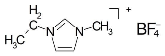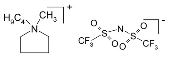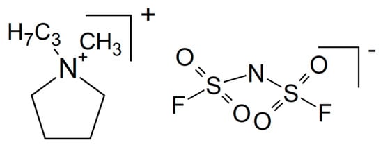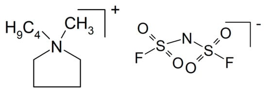 A composite of NaAlCl4 with embedded particles of Al2O3 was prepared by mechanochemical synthesis []. The latter provides additional conduction along an oxychloride interface between the two constituents, yielding σRT > 0.1 × 10−3 S/cm. An all-solid-state battery demonstrated electrolyte suitability. An overview on sodium-conducting halides as potential solid electrolyte materials is available []. Also, by mechanochemical synthesis, a composite of NaI and Na2.88Sb0.88W0.12S4 has been prepared, where the formed solid electrolyte Na2.88Sb0.88W0.12S4·0.5NaI showed σ = 3.6.1 × 10−2 S/cm and was tested in an all-solid-state battery []. For enhanced ion conduction of Na3Zr2Si2PO12 (called NACICON instead of NASICON or NASICON-like for unknown reasons), a glass of 35Na2O-5Cr2O3-30TiO2-30P2O5 was infiltrated into the porous ceramic, and use of the product in sodium-ion batteries was proposed []. Increased ionic conductivity of Na3Zr2Si2PO12 by adding NaF into the precursor mixture during preparation has been reported, where conductivity increased from σRT = 4.5 × 10−4 S/cm to σRT = 1.7 × 10−3 S/cm []. A porous pellet of Na2ZnSiO4 (halloysite) with an ionic liquid N-butyl-N-methylpyrrolidinium bis(trifluoromethyl sulfonyl) imide (PYR14TFSI, see Figure 8) and NaTFSI yielded a solid electrolyte with σ300°C = 1.1 × 10−3 S/cm and t+ = 0.5, suggesting to the authors its use in sodium-ion batteries []. A composite of clay and cellulose nanocrystals has been described as a sodium-ion-conducting electrolyte with conductivities around 10−3 S/cm, without revealing its preparation details []. NaNH2 was reacted with B10H14, yielding solid electrolyte core–shell composites of NaBH4 and Na2B12H12 with σ100°C = 1 × 10−4 S/cm []. A solid-state sodium-ion battery with this composite electrolyte was run for 100 cycles.