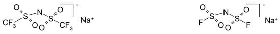 The notorious tendency of PEO to crystallize (for a study of correlations between crystallinity and ionic conductivity as a function of the fraction of added ceramic filler, see []) has been decreased by grafting yielding a hyperbranched polyether, and with NaTFSI (see Figure 9), it showed an increased conductivity σRT = 5.7 × 10−4 S/cm []. A cell with a sodium-metal electrode (called a sodium-ion battery) nevertheless kept 92% of its initial capacitance after 300 cycles. A solid composite electrolyte of PEO and NaTFSI with added NASICON-type Na3.4Zr1.8Mg0.2Si2PO12 with σ80°C = 2.8 × 10−3 S/cm was used in a sodium/Na3V2(PO4)3 (NVP) battery operated for 80 cycles without significant losses []. To a mixture of PEO and NaFSI (see Figure 9) with the mass ratio 20:1 (this is presumably meant with the rather uncommon designation P(EO)20NaFSI and later EO:Na = 20:1) the researchers dissolved in acetonitrile various amounts of PYR14FSI (see Figure 10), yielding after evaporation of the solvent a solid electrolyte with σRT = 1.15 × 10−4 S/cm (without the ionic liquid σRT = 2.85 × 10−6 S/cm) tested in a sodium-metal/NVP battery at T = 60 °C []. A capacitance retention 85% after 300 cycles was reported. Conductivity improvement by the added ionic liquid was attributed to increased amorphicity and stronger interactions between NaFSI and the PEO oxygen atoms. With respect to desired sodium-ion transport and electrostatics, presumably interactions between said functionalities and the anion FSI− were meant.