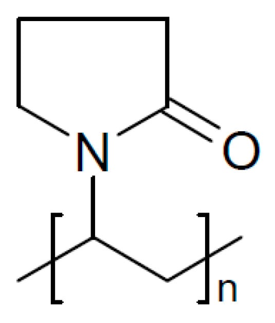 A polymer blend of PEO and polyvinyl pyrrolidone (PVP, Figure 13) with NaIO4 as a salt composited with TiO2 nanoparticles has been prepared for a sodium []. At 10 wt.% salt and 3 wt.% filler, σRT = 9.82 × 10−6 S/cm was found, and as a reason, the increase in the dielectric constant of the material causing an increase in the concentration of mobile ions and their mobility was suggested.