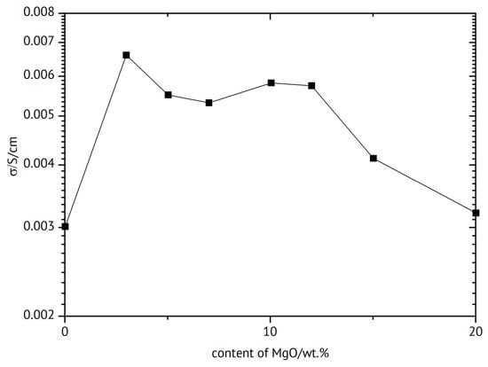 To PVA with NaClO4 as the salt (presumably not the filler as claimed in the text), Y2O3 was added as an inorganic filler, affording a solid composite electrolyte with σRT = 3.25 × 10−4 S/cm and t+ = 0.919 at the optimum composition with 3 wt.% filler (because the total composition of this material was given as 123%, uncertainty remains, and that is also the case regarding other barely comprehensible claims in this report) []. High conduction and t+ were attributed to lower crystallinity caused by the filler and strong interactions between it and the salt anion. For the assembled complete cell, the typical zinc electrode reaction was provided for the negative electrode, and for the positive one, the PbO2 and the V2O5 reactions. The decrease in crystallinity of PVA by adding various amounts of salts like MgSO4 or Li2SO4 has been demonstrated []. The effect was more pronounced with the lithium salt. At concentrations beyond around 20 wt.%, crystallization of the added salt starts, and conductivity decreases again.
