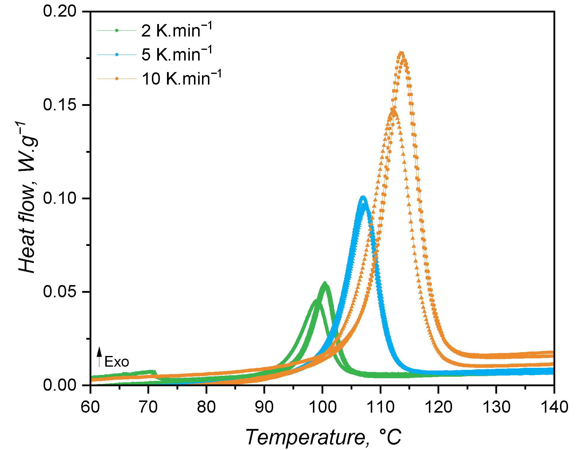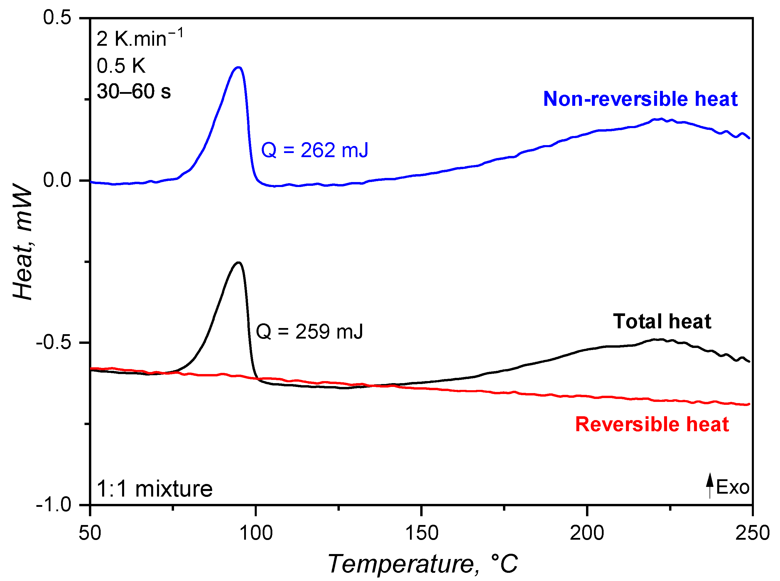 Figure 3, where exothermal events are represented by peaks pointing upwards. As explained before, MDSC is able to decompose the total heat (as measured in conventional DSC devices) into reversible and non-reversible components. For liquid silicone rubber, the crosslinking appears as an exothermal signal below 100 °C, with 262 mJ released energy, in the total and non-reversible heat curves. Since crosslinking is a kinetic phenomenon, it appears as released non-reversible heat. However, no exothermal signal is present in the reversible heat. This is the first indication that the specific heat capacity, i.e., the amount of energy (J) necessary to increase the temperature of 1 g of material by 1 K, does not change during the crosslinking reaction. Stark, McHugh, and co-workers [
