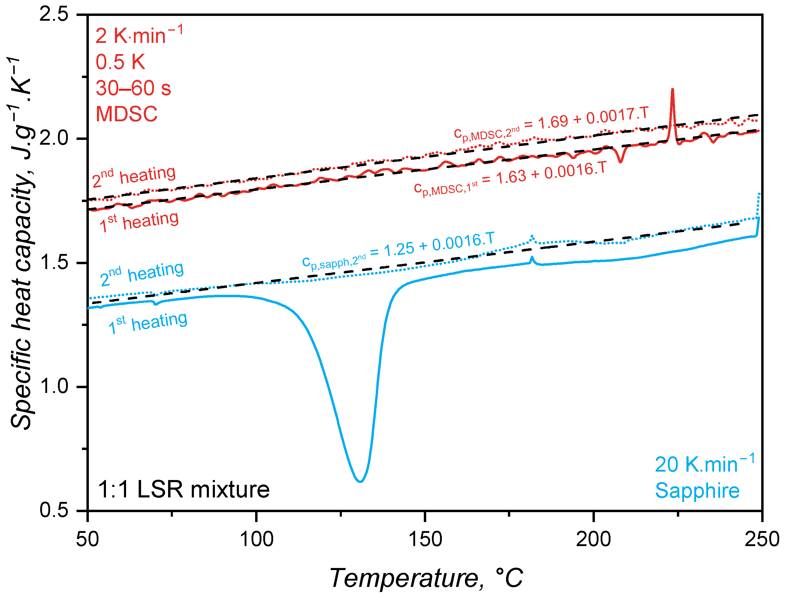 values (MDSC values are higher than the sapphire one). This baseline shift can be associated with the sample contact with the DSC pan, which is different for every measurement since liquid silicone rubber cannot perfectly sit in the bottom of the pan and the contact is highly dependent on how the operator places the sample inside it. From the linear fittings shown in