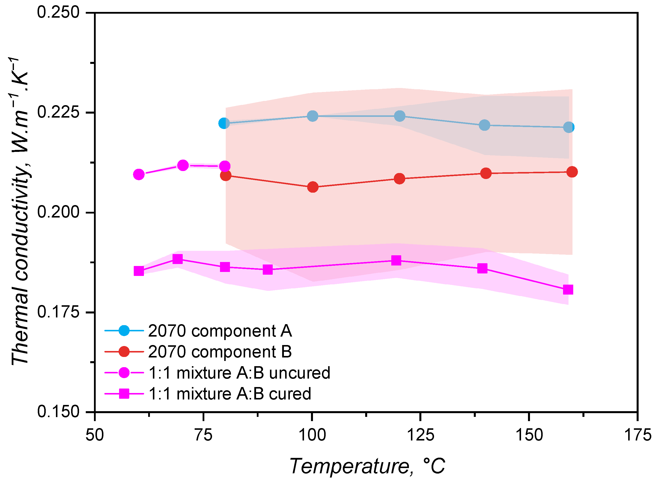 Figure 5 for all components. It is valuable to remember, at this point, that the samples’ 2070 component A, 2070 component B, and the 1:1 mixture A:B uncured were tested by employing the transient line-source method, since it allows the thermal conductivity determination of liquid-like samples. Sample 1:1 mixture A:B cured, on the other hand, had its thermal conductivity measured via a guarded heat flow meter device under steady conditions for the temperature. The measurement temperature range for the 1:1 mixture A:B uncured was limited to 80 °C to avoid the curing reaction. For all samples, the thermal conductivity did not considerably vary with temperature, being statistically the same for the whole tested temperature range and varying around the value