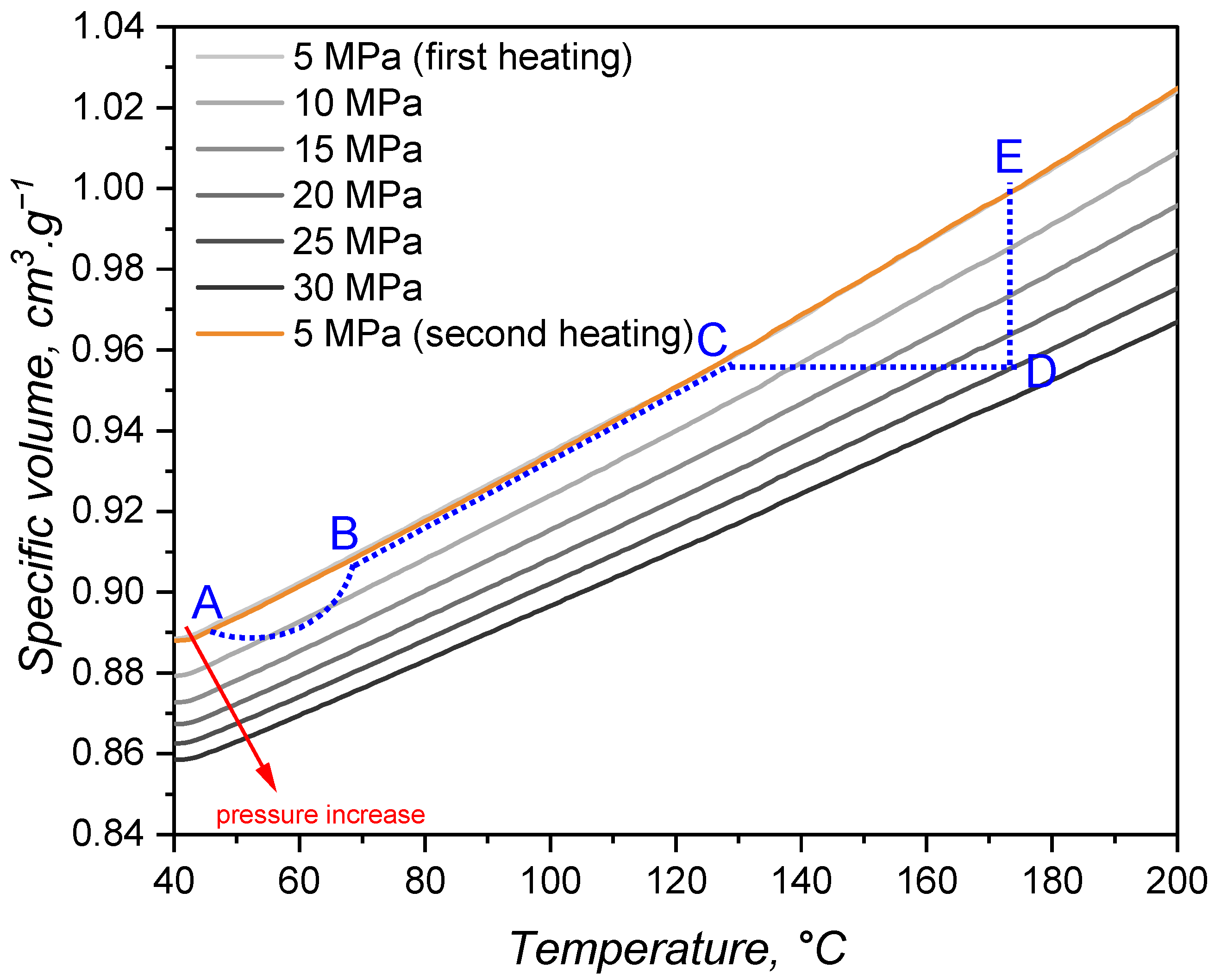 31]. For the studied LSR grade, the specific volume under various isobaric conditions as a function of the temperature is presented in