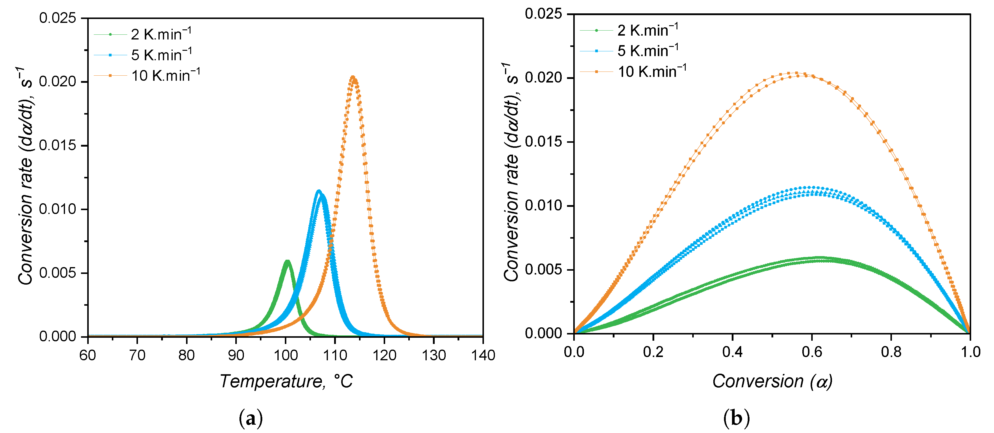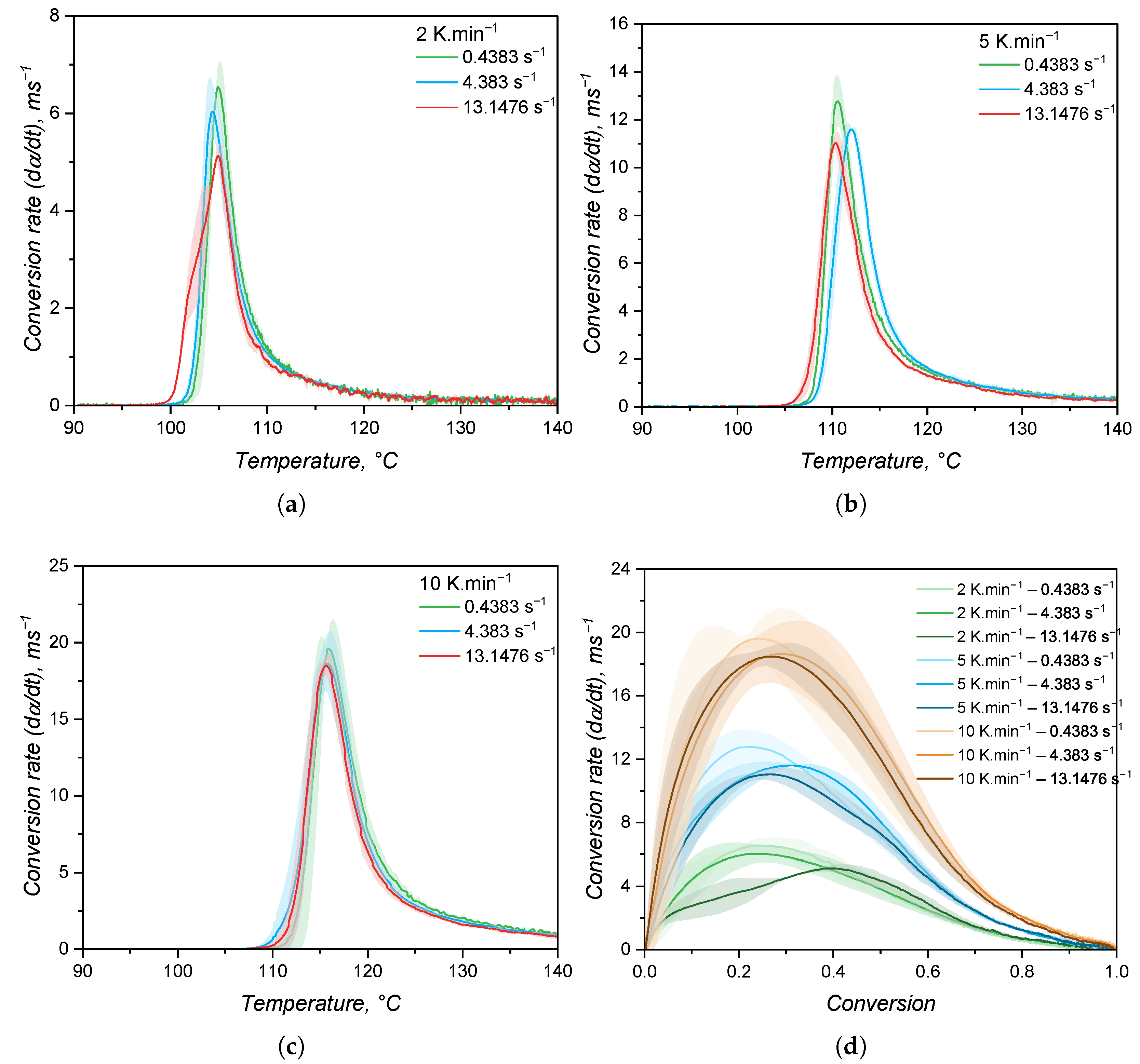 for the first heating, which is related to the way this value is calculated, i.e., based on the total released heat. Since the crosslinking reaction is exothermal, the sample heats up at a faster pace compared to the reference pan of the DSC device, resulting in a decrease in the specific heat capacity. As the curing conversion reaches 100%, the rate of heat release decreases and the