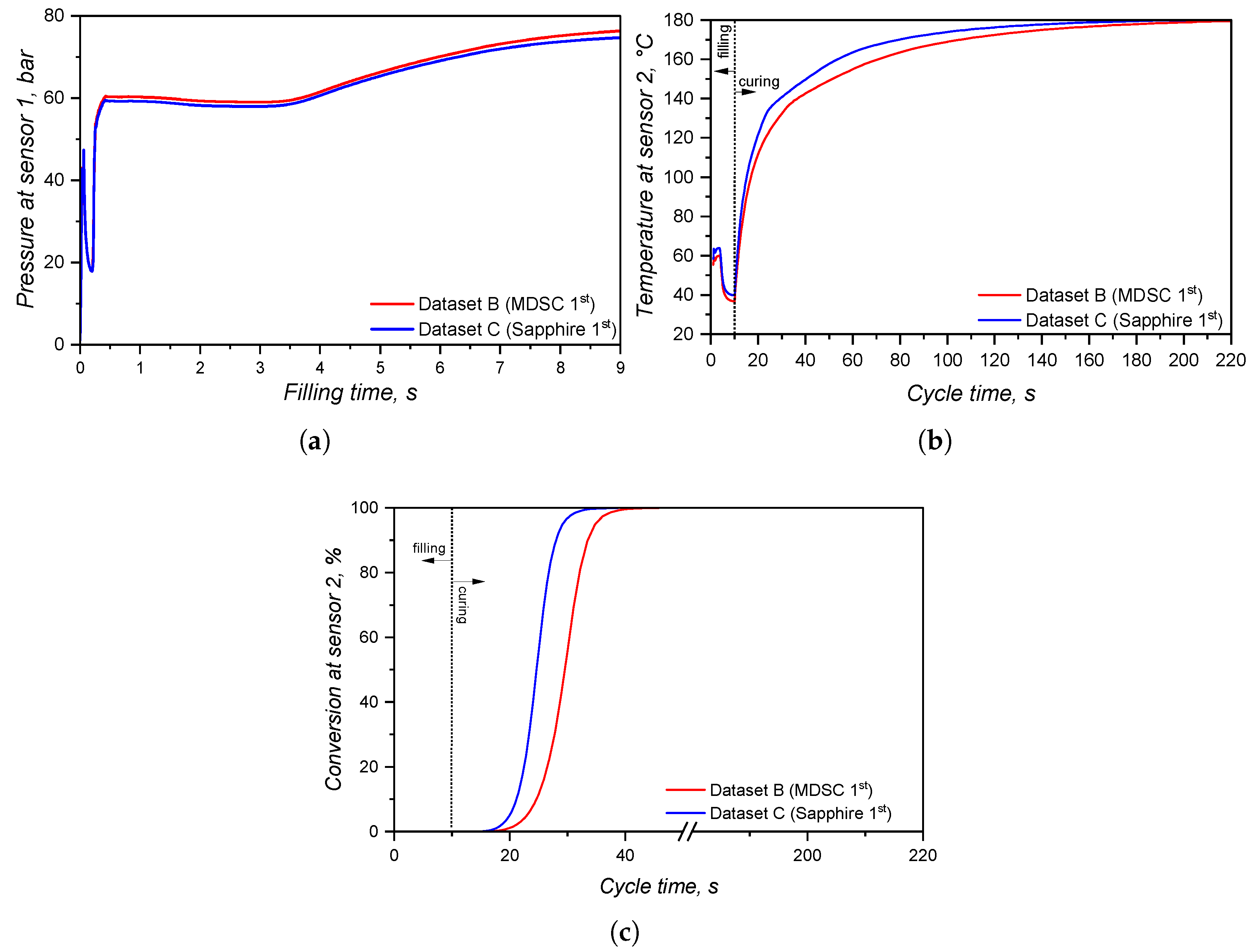 The specific heat capacity of liquid silicone rubber during crosslinking was then determined based on the reversible heat for the MDSC approach and considering the sapphire reference for the standard ASTM E1269. For this comparison, the first heating in the DSC program is related to the uncured sample, during which the crosslinking reaction occurs, whereas the second heating step involves the already crosslinked sample. In