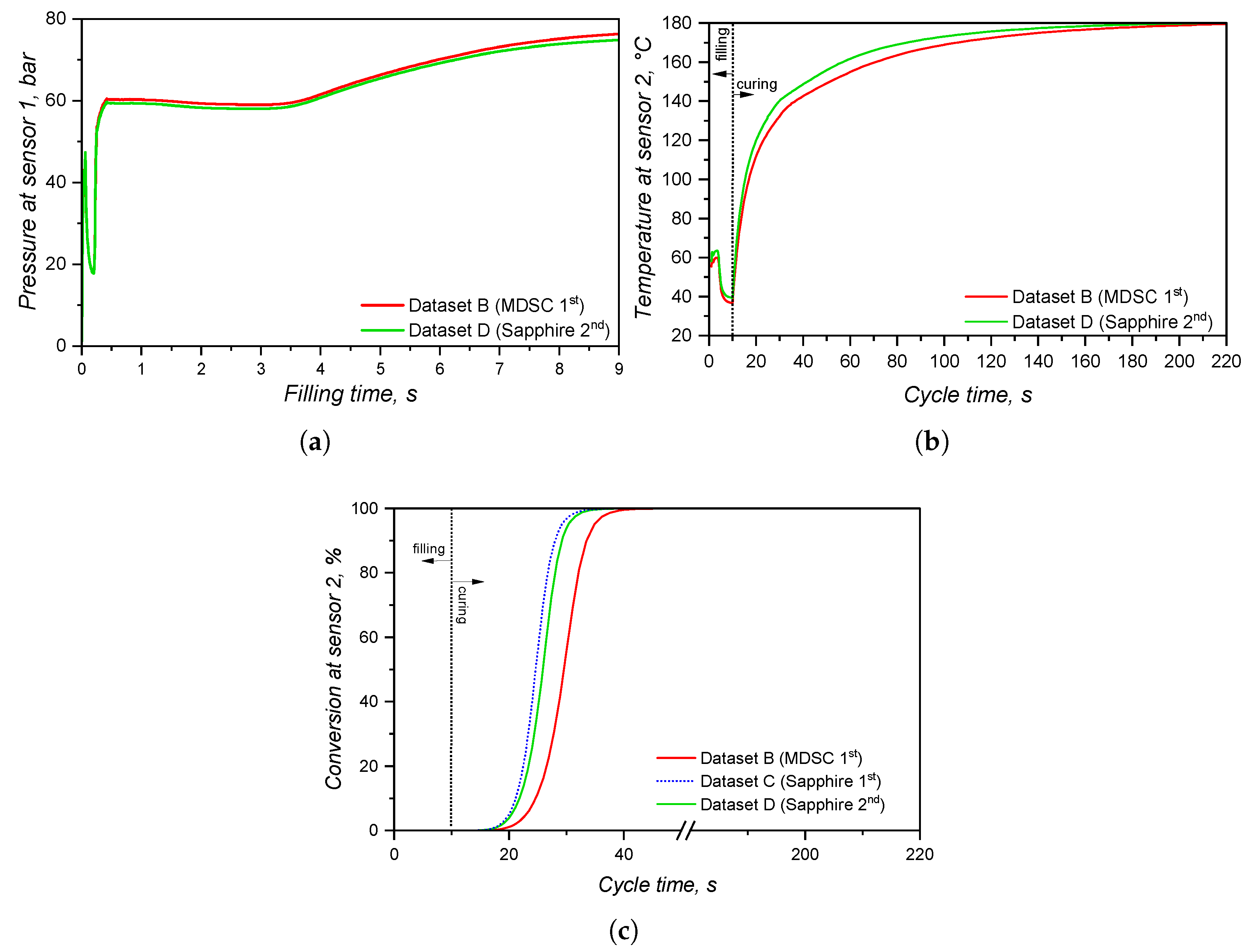trend as shown by the full blue line reflects the exothermal nature of crosslinking, which is an important aspect to account for in injection moulding simulation. For the completely cured sample, the second heating shows a linear