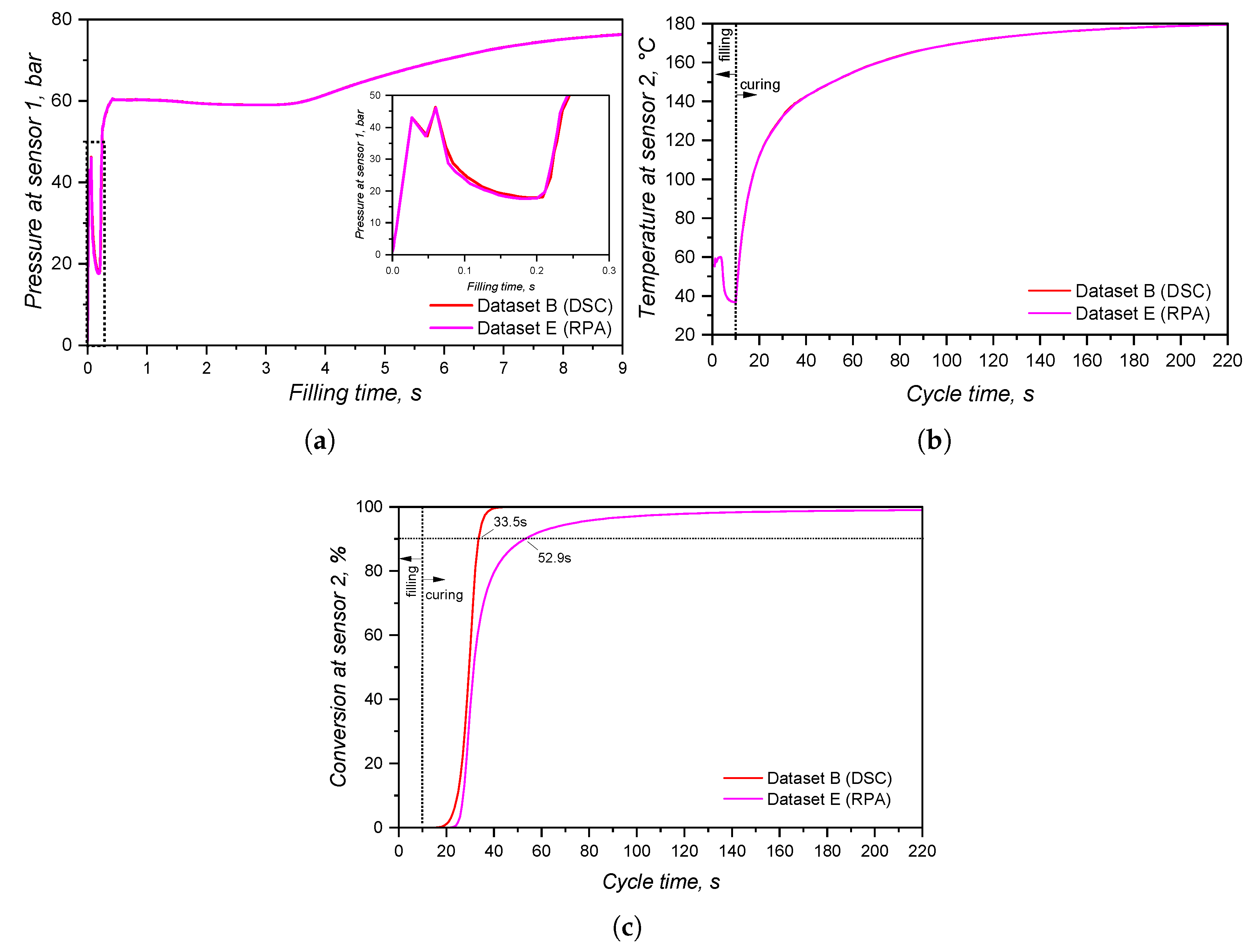 Figure 6) and heating mostly due to shear-related dissipation. Injection is over at point B, when the pressure is equalised and the cavity is completely filled. Heat transfer from the hot mould to the uncured LSR occurs, leading to heating and thermal expansion in steps B-C. Due to the fact that filling is normally carried out subvolumetrically, LSR is further heated under isochoric pressure to point D. The cavity conditions are held until the part is fully cured, being ejected to point E and further cooled down back to point A.