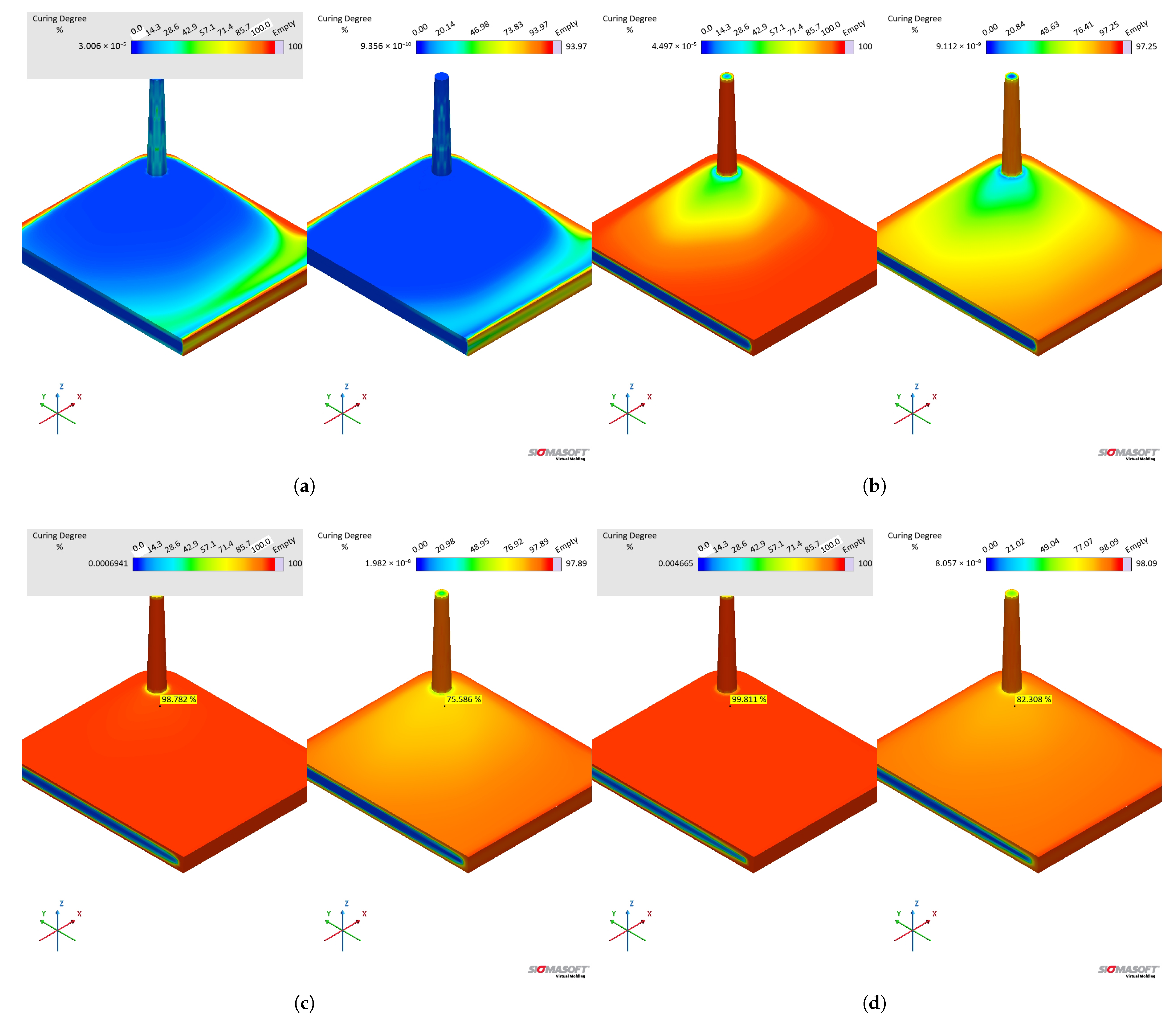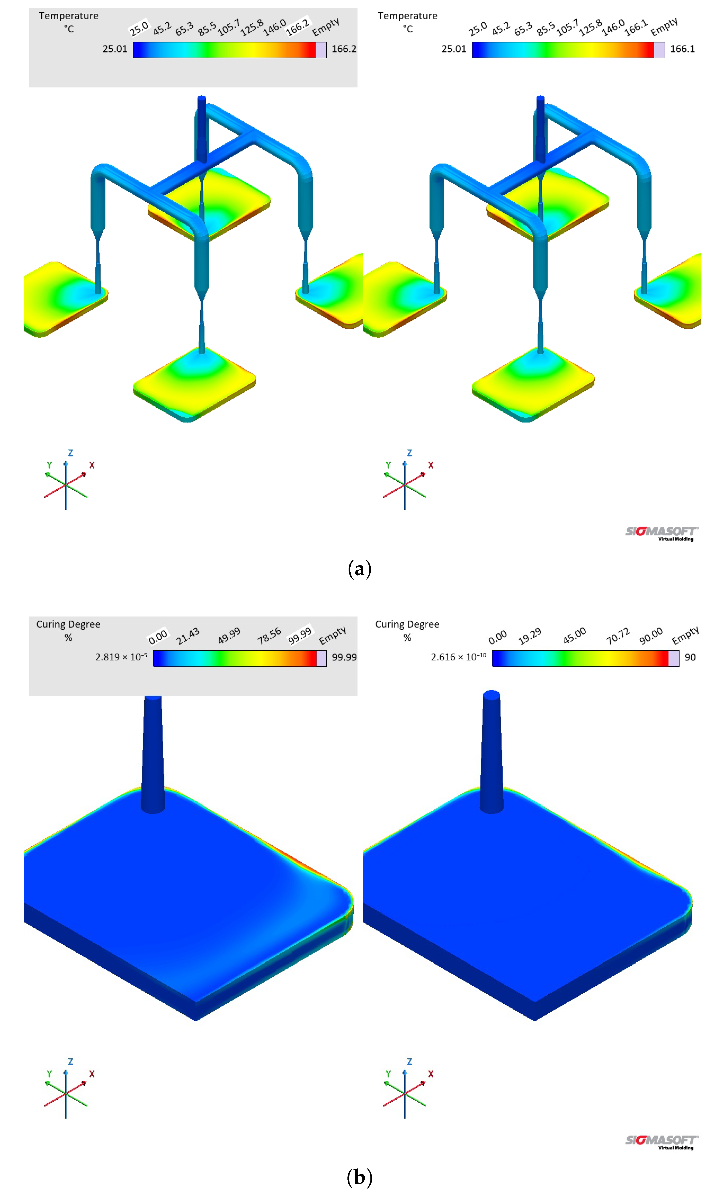 This section is divided into two parts. The first part introduces the material behaviour in terms of the investigated properties and highlights the main differences between the applied methods, reasoning them in terms of macromolecular and structural behaviour. Secondly, the material behaviour is translated into material data (sub-datasets) and implemented in injection moulding simulations, whose results are critically compared.