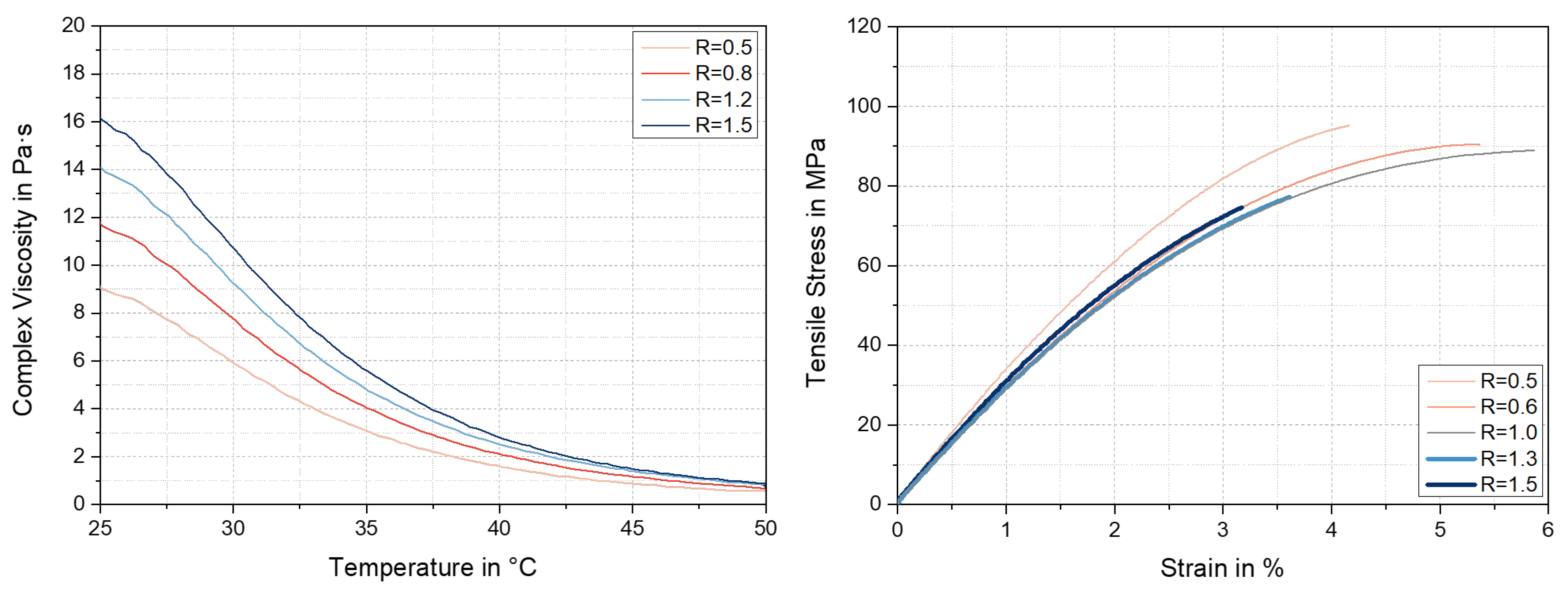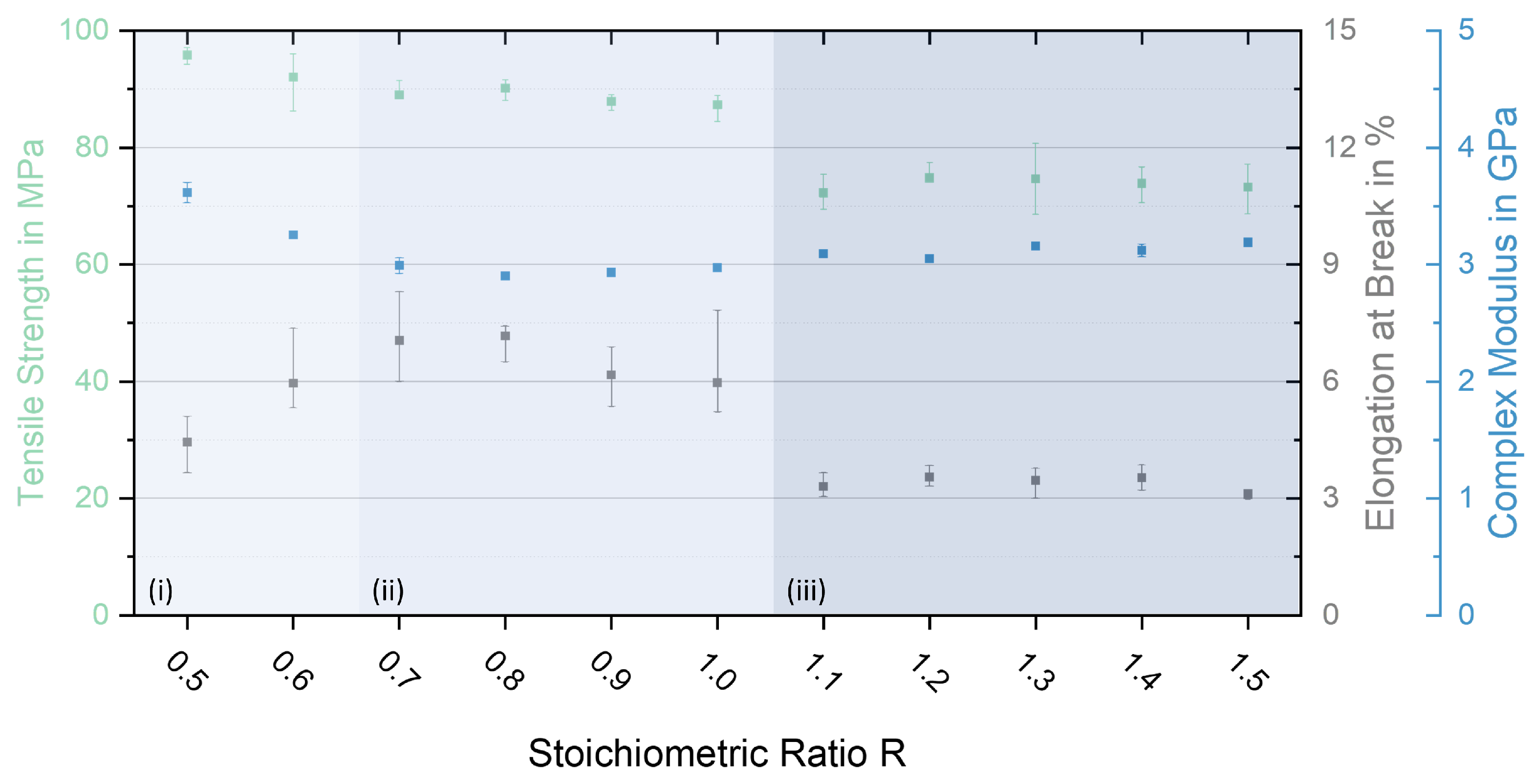 | Stoichiometric Ratio R | Tensile Strength in MPa | Elongation at Break in % | Young’s Modulus in GPa | Elastic Modulus (DMA) in GPa |