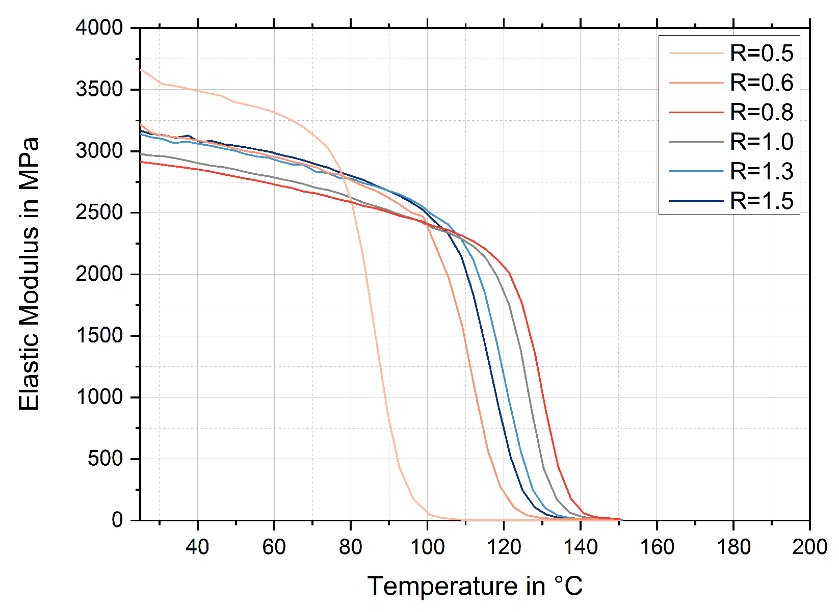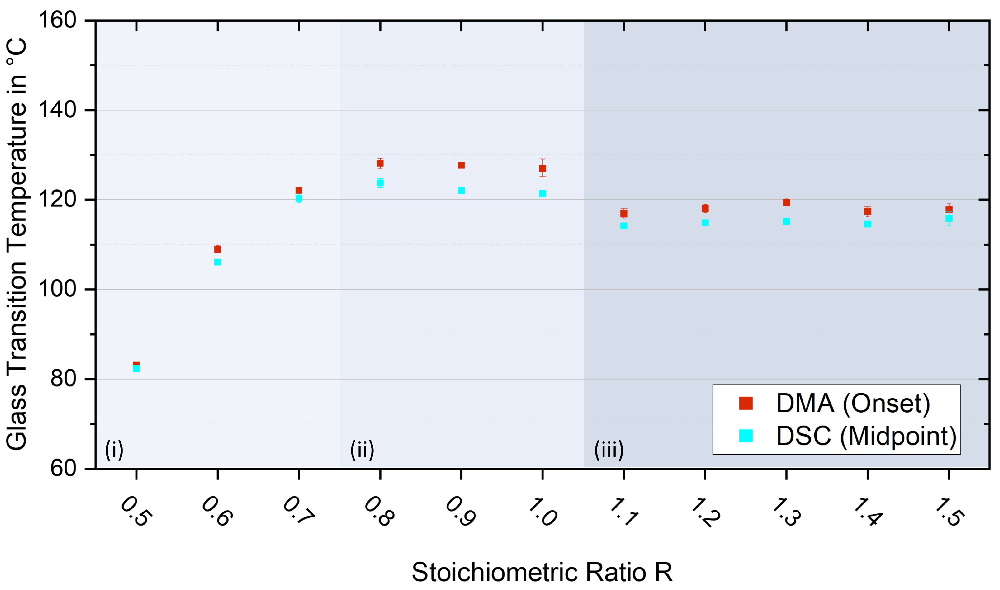 | Stoichiometric Ratio R | Tg DSC Midpoint in °C | Tg DMA Onset in °C |