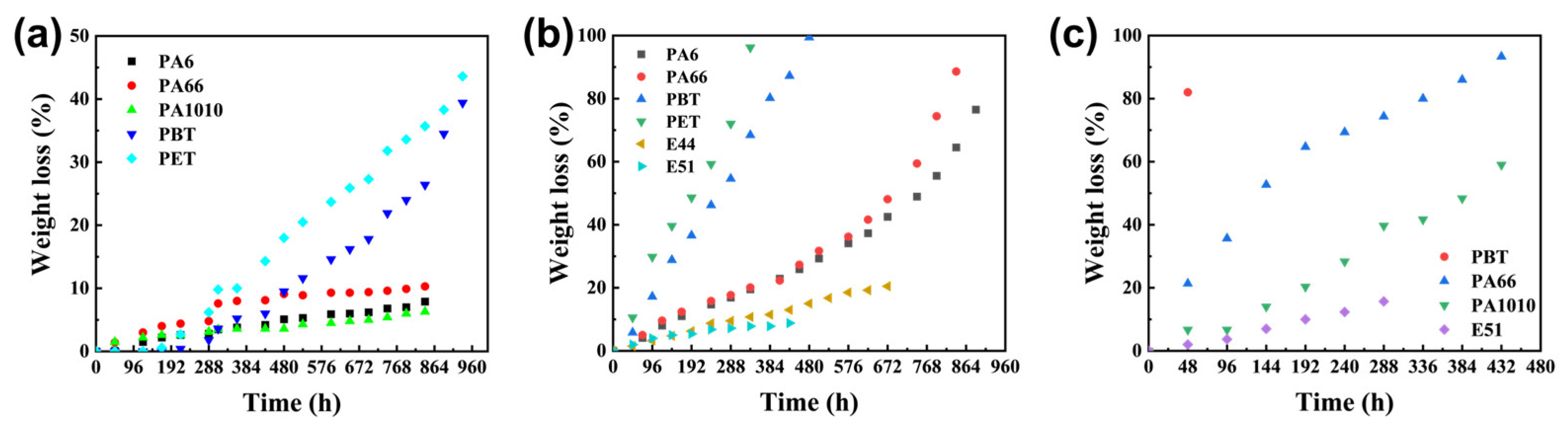 18]. Consequently, significant hydrolysis occurs at 120 °C. At elevated temperatures of 150 °C and 180 °C, enhanced molecular thermal motion further accelerates bond breaking and water diffusion, leading to a dramatic increase in hydrolysis rate. In summary, polyamide and polyester are more susceptible to temperature variations, offering greater potential for designing their degradation curves. Consequently, these two materials were selected as research subjects for further analysis.