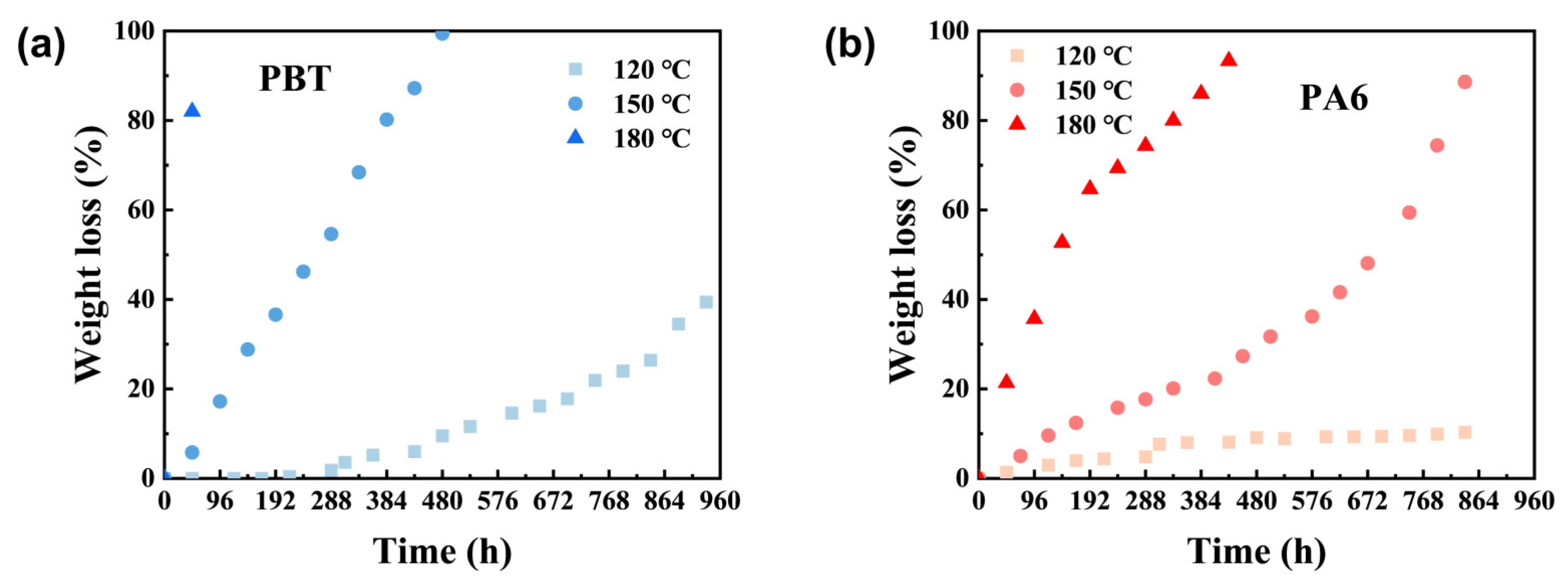 w) hexamethylenediamine to a 150 °C NaOH aqueous solution significantly accelerated the degradation rates of both PBT and PET throughout the entire degradation process. However, in practical applications, small-molecule additives may exhibit migration under high-temperature and high-pressure conditions, potentially compromising performance stability.