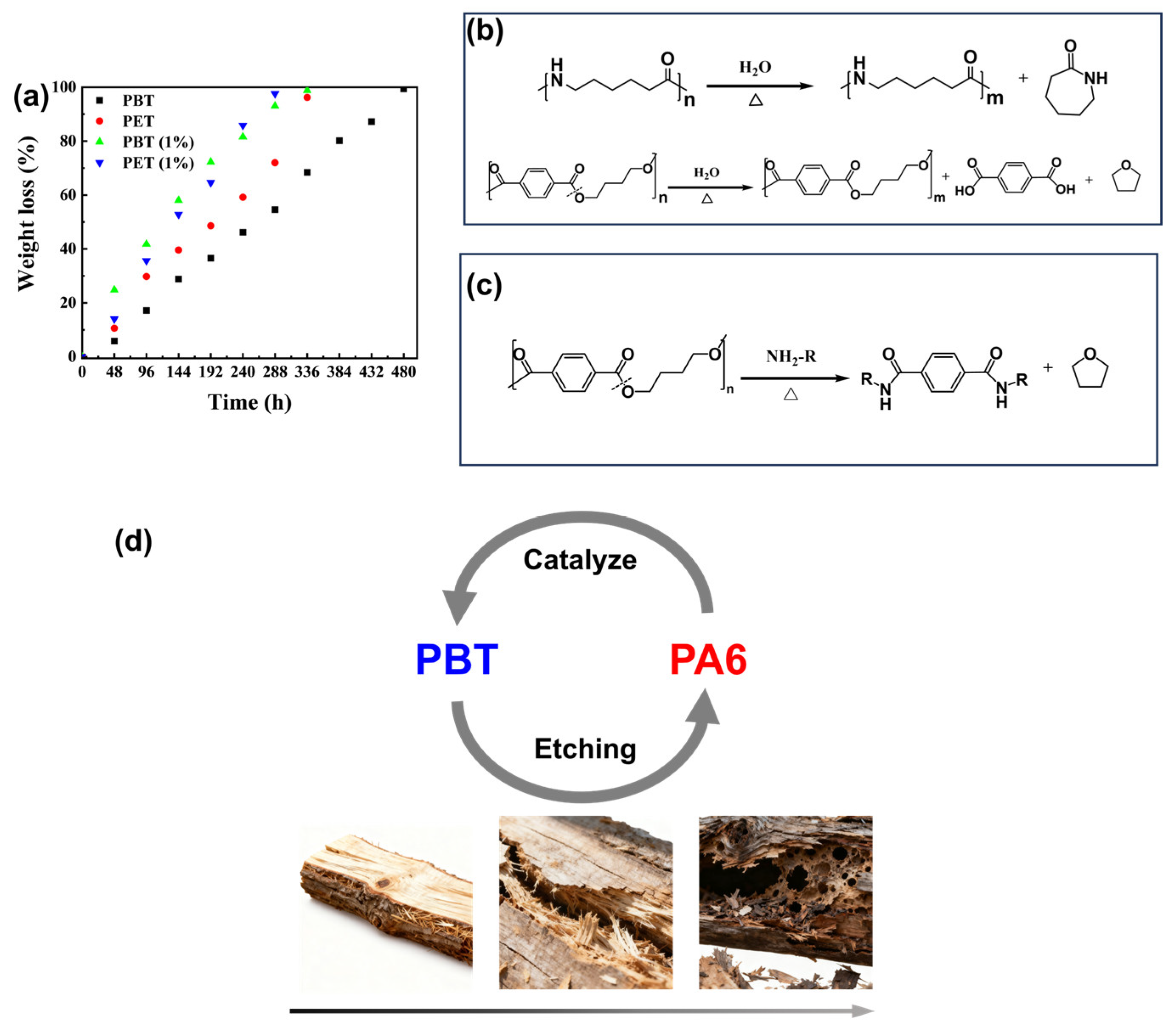 This established a preliminary material platform library capable of regulating degradation rates across a broad range. While slow-degrading materials are readily available, certain applications require rapid degradation. To further broaden the range of degradation rates, we drew inspiration from the natural decay process of wood. By leveraging the synergistic “etching acceleration-chemical catalysis” interaction between poly (butylene terephthalate) (PBT) and polyamide 6 (PA6), we achieved a degradation rate where 1 + 1 > 2. Specifically, although PA6 hydrolyzes slowly, the resulting terminal amine groups catalyze the hydrolysis of PBT. The rapid hydrolysis of PBT induces etching within the polymer matrix, creating numerous pores that increase the specific surface area. This, in turn, significantly accelerates the hydrolysis rate of PA6. Through this synergistic effect, the degradation rate of the blend material is markedly enhanced. This study proposes a material design strategy based on physicochemical synergistic effects that can significantly enhance degradation rates. It provides crucial reference for the design and application of high-temperature temporary plugging agents.