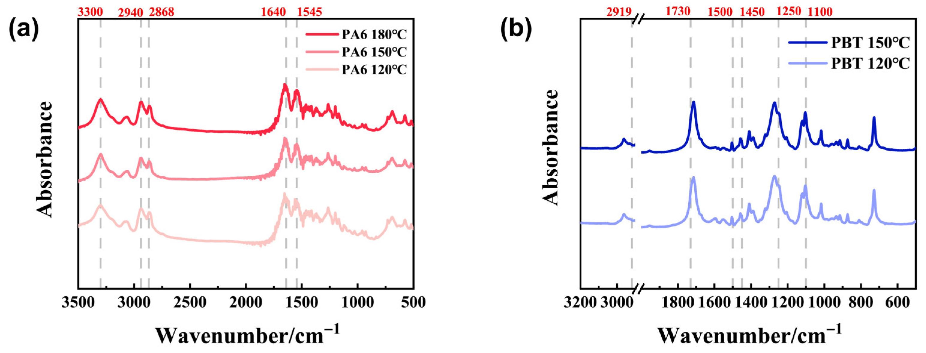 −1 result from C-O vibrations. Similar to the solid-phase degradation products of PA6, the positions and intensities of the main peaks did not show significant changes at different temperatures, indicating that the solid-phase degradation products of PBT are unique at different temperatures.