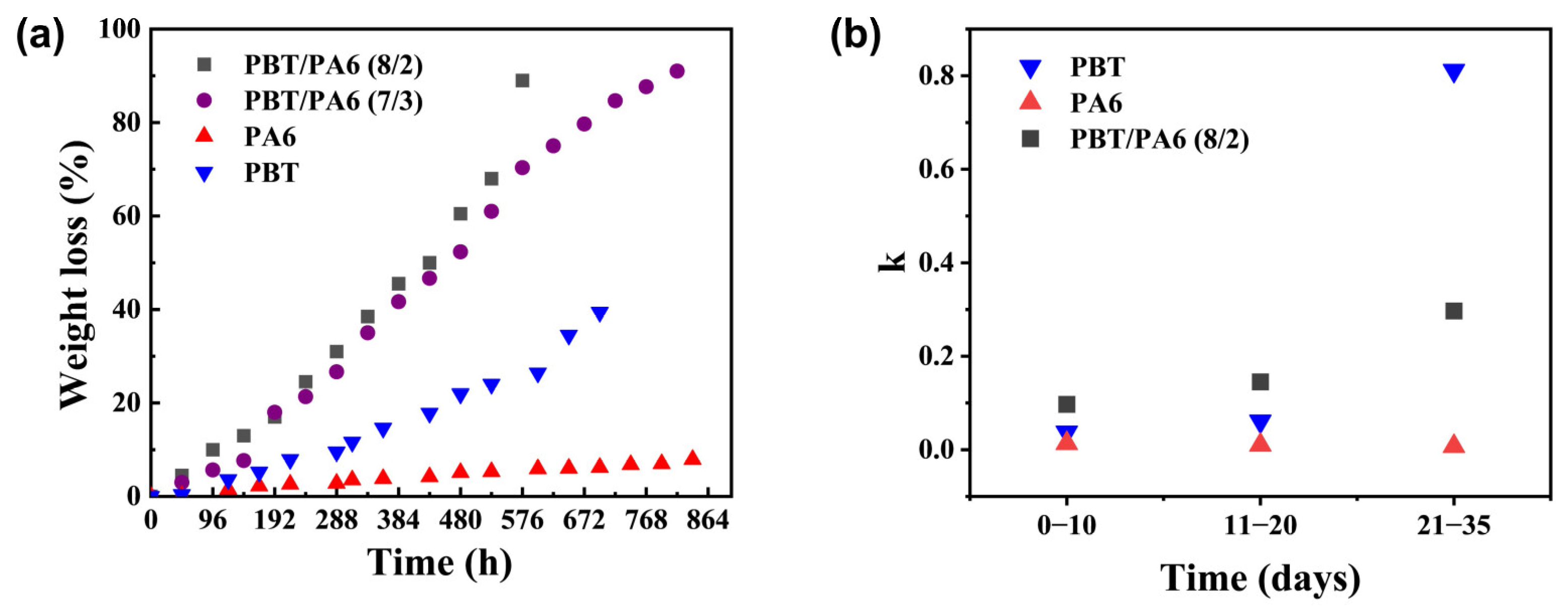 Figure 6a. The degradation rates of both PBT/PA6 blend formulations were significantly faster than those of pure PBT and PA6 materials. The degradation curves for the two pure materials and the PBT/PA6 blends were linearly fitted for the pre-hydrolysis phase (0–10 days), mid-hydrolysis phase (11–20 days), and late-hydrolysis phase (21–35 days). The resulting slope k values are shown in