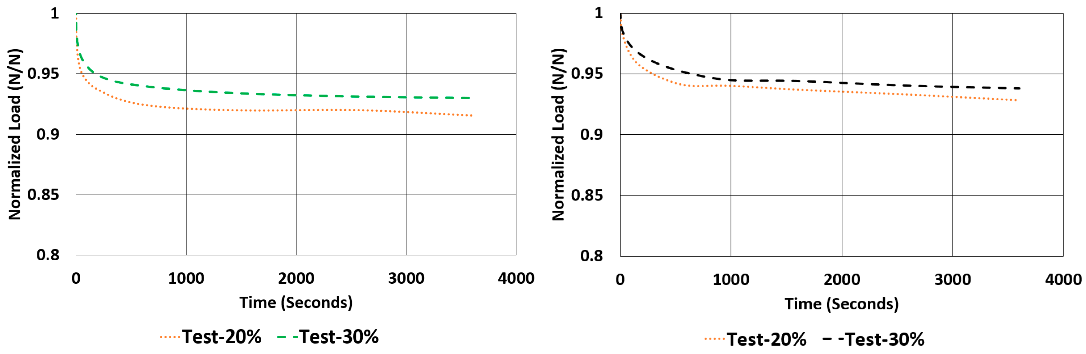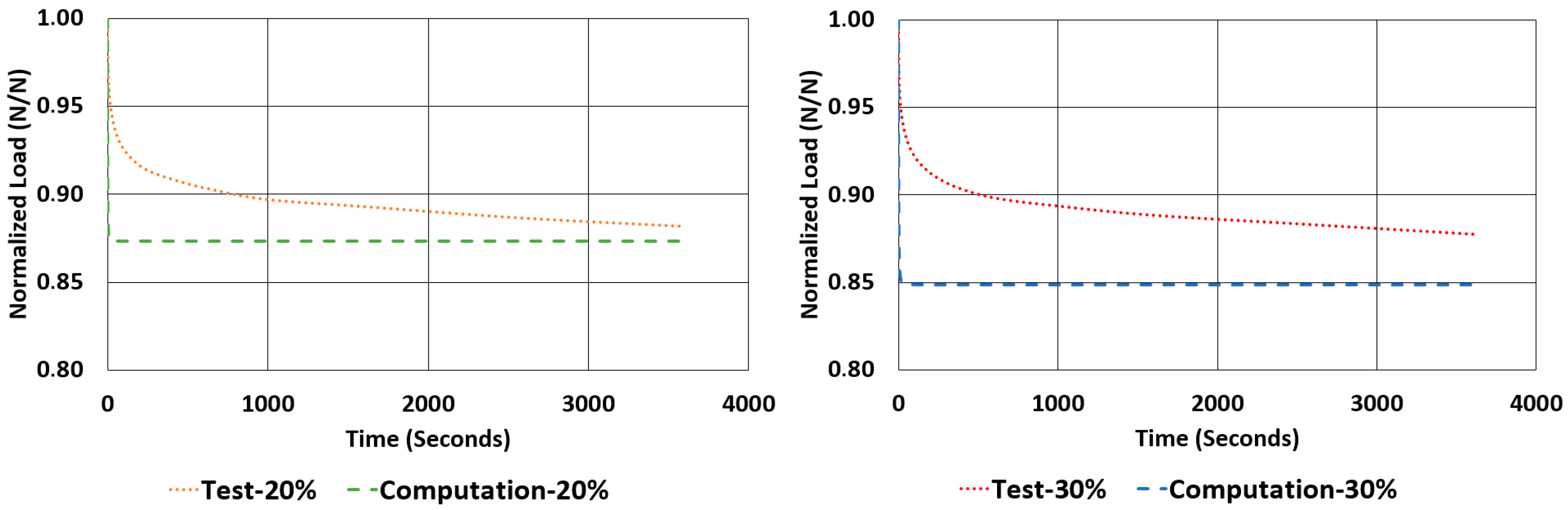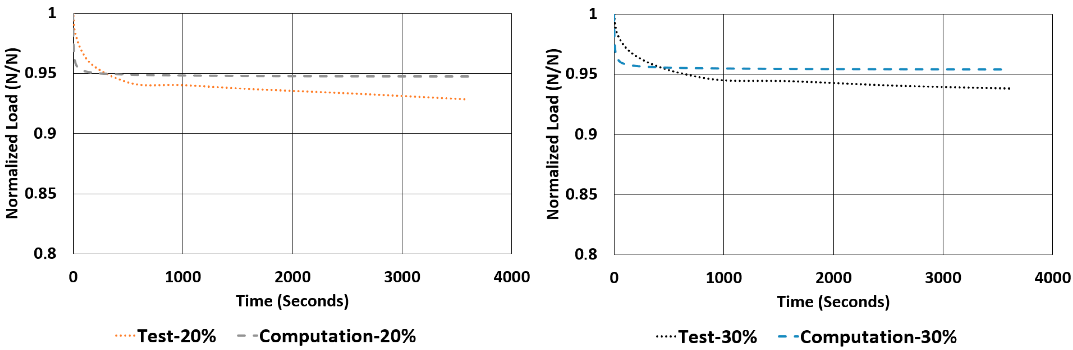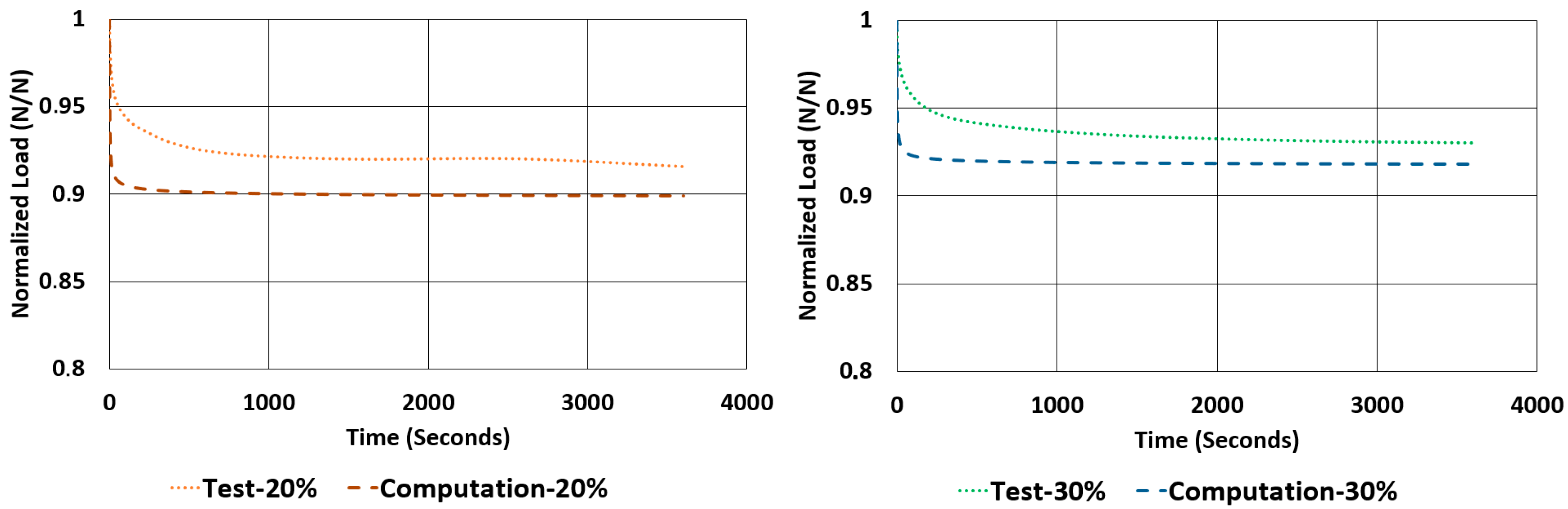 The rate of relaxations (RORs) obtained in tests and computations have shown obvious differences. However, normalized load values at the end of relaxation tests and computations are very close to each other. The maximum deviations encountered for these values are not more than −3.33% and 1.07%. Considering the total drop in the total normalized relaxation values obtained using tests and computations are giving a relationship, which was expected from theoretical point of view. For example, in