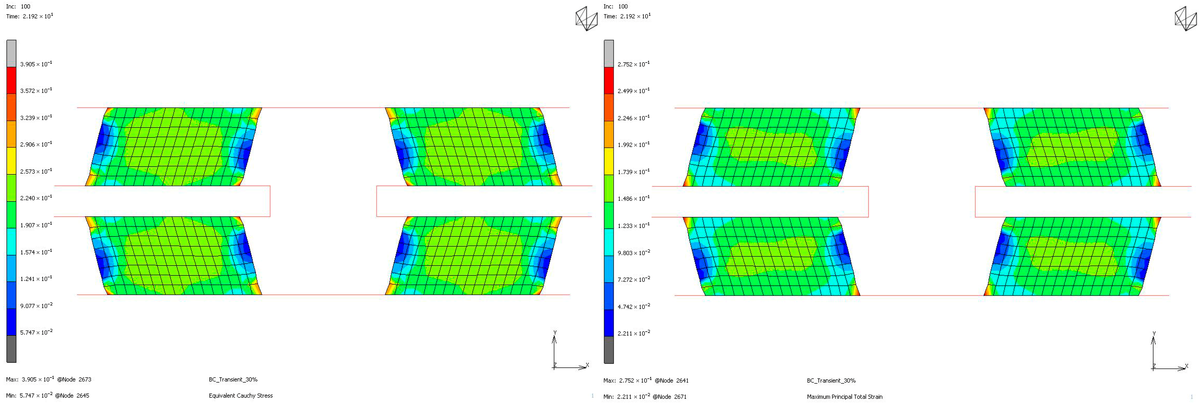 Table 8, the coefficients used to characterize the material models are given. These coefficients were obtained using the curve fitting tools given in Marc Mentat 2024.2 software. These tools can calculate both Arruda–Boyce and Bergström–Boyce material coefficients for a given set of stress–strain data in various loading modes. In this study, uniaxial compression and simple shear stress–strain data (data shown between