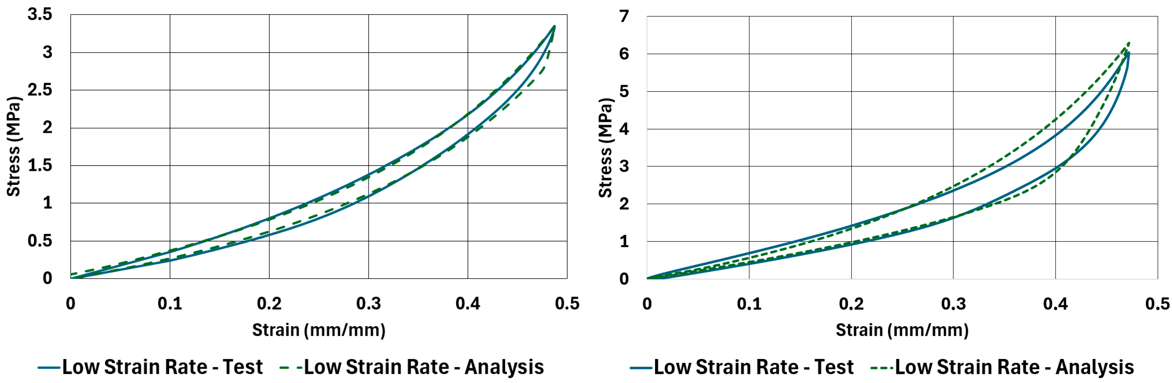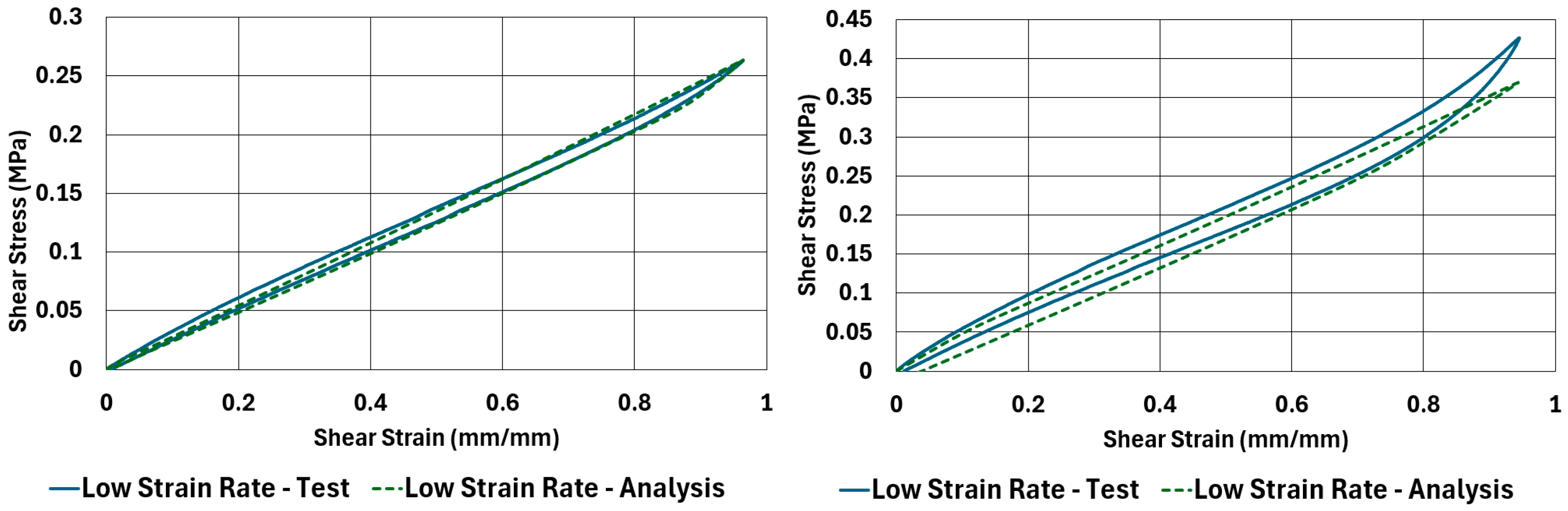 After the completion of quasi-static cyclic tests, the load–displacement and corresponding stress–strain data can be obtained at each cycle at each applied strain rate. The values collected at the latest cycle (4th cycle) are considered to be the equilibrium mechanical properties of each material at each value of strain rate under compressive and shearing loads. In this study, the constitutive model coefficients are obtained using the stress–strain data pairs obtained in the last cycle (4th cycle) of quasi-static tests.
