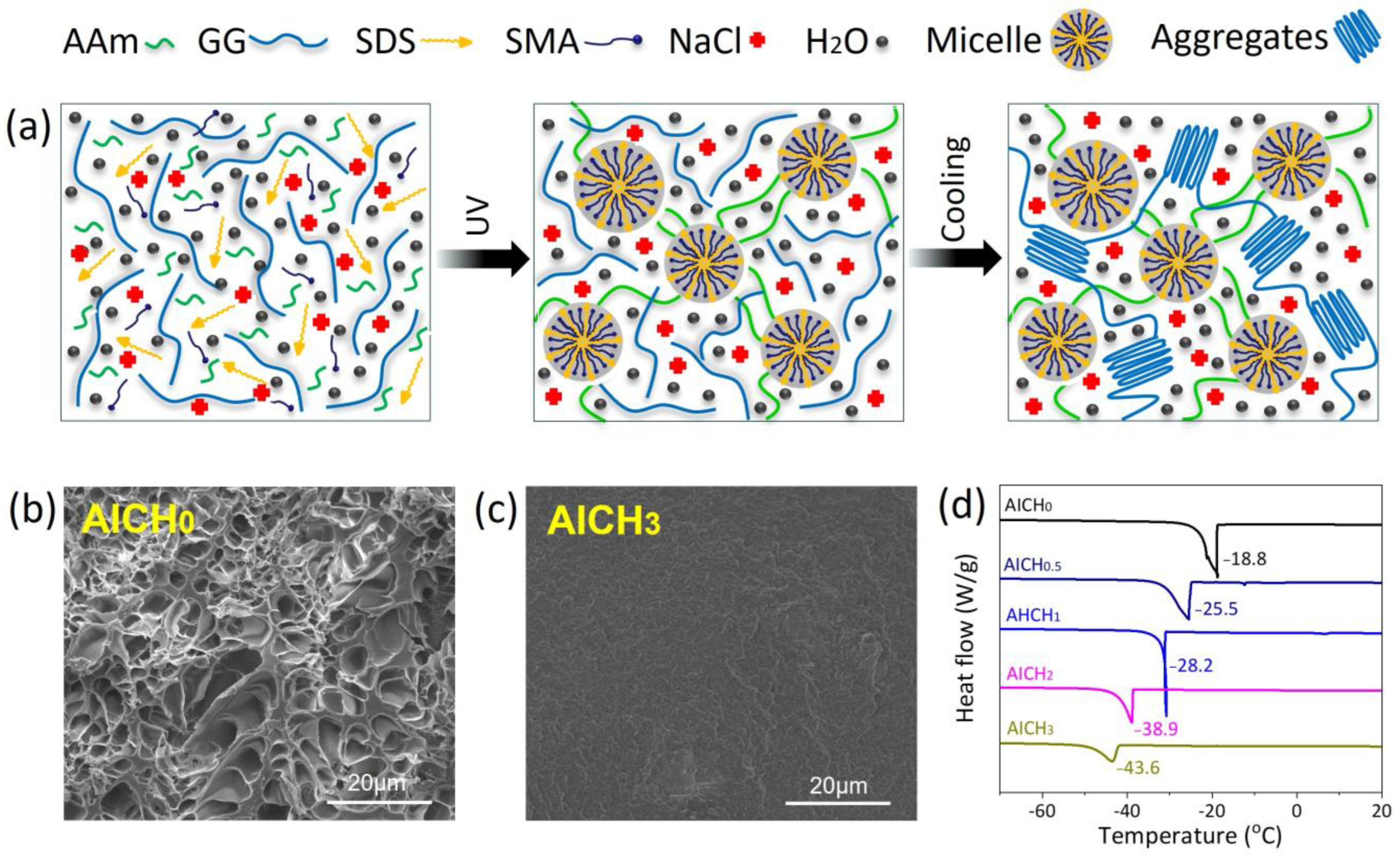 The schematic diagram for the preparation of AICH is presented in Figure 1a. The hydrophobic SMA monomers are dissolved in the self-assembled SDS micelles under the solubilization of NaCl, and then the HAP network is formed under UV light, where the SMA micelles are used as the hydrophobic association point. As the temperature is decreased, the conformation of GG changes from random coils to double helices, and then the aggregation of double helices results in the formation of the GG network. Finally, the physically crosslinked GG/HAP double network is obtained. In the GG/HAP double network hydrogel, NaCl plays multiple roles. First of all, NaCl increases the solubility of hydrophobic SMA in aqueous solution and promotes the formation of micelles and construction of HAP; NaCl also enhances the aggregation capability of gellan gum double helices, thus increasing the crosslinking densities of HAP and GG and producing a dense network, as evidenced by FESEM images of HAP/GG hydrogels (Figure 1b,c). It is apparent that the HAP/GG hydrogels with a high content of NaCl (3 mmol/g) produce a denser network structure than those without NaCl. The second is that the presence of NaCl weakens the hydrogen bonding interaction of H2O molecules, thus greatly decreasing the freezing point of GG/HAP hydrogel. It is found from DSC measurements that the freezing point decreases from −18.8 °C to −43.4 °C as the content of NaCl increases from 0 mmol/g to 3 mmol/g (Figure 1d). The rheological temperature sweep demonstrates a similar freezing tolerance of GG/HAP hydrogels. The third is that the presence of NaCl greatly enhances the conductivity of the resultant GG/HAP double network hydrogel at subzero temperatures, which will be discussed later.