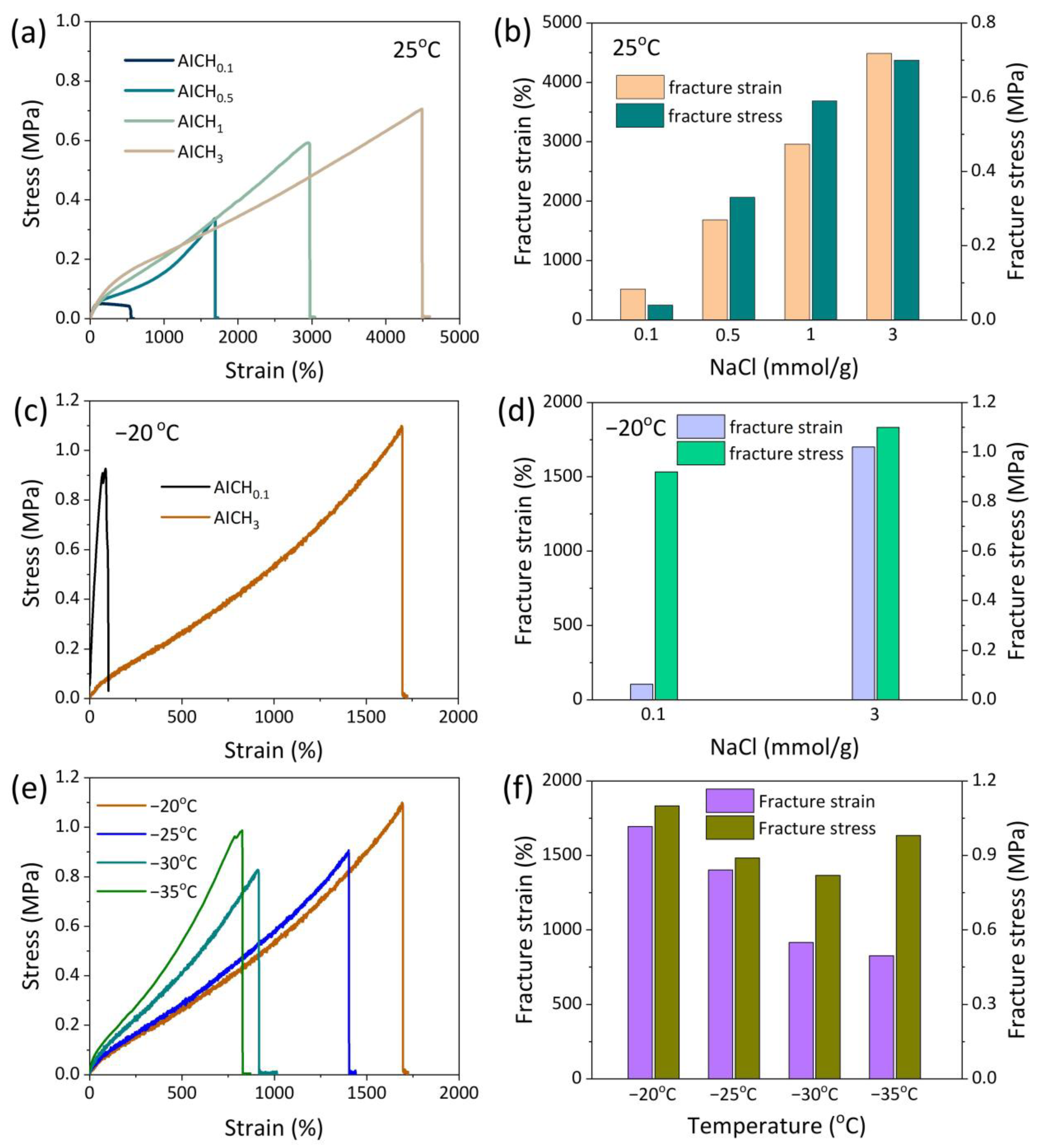 Figure 2. (a) The tensile stress-strain curves of AICH with various NaCl contents at room temperature, and (b) the corresponding effect of NaCl on the fracture strain and stress. (c) The tensile stress−strain curves of hydrogels with various NaCl contents at −20 °C, and (d) the corresponding effect of NaCl on the fracture strain and stress. (e) The tensile stress-strain curves of AICH3 at different subzero temperatures, and (f) the corresponding effect of temperature on the fracture strain and stress.