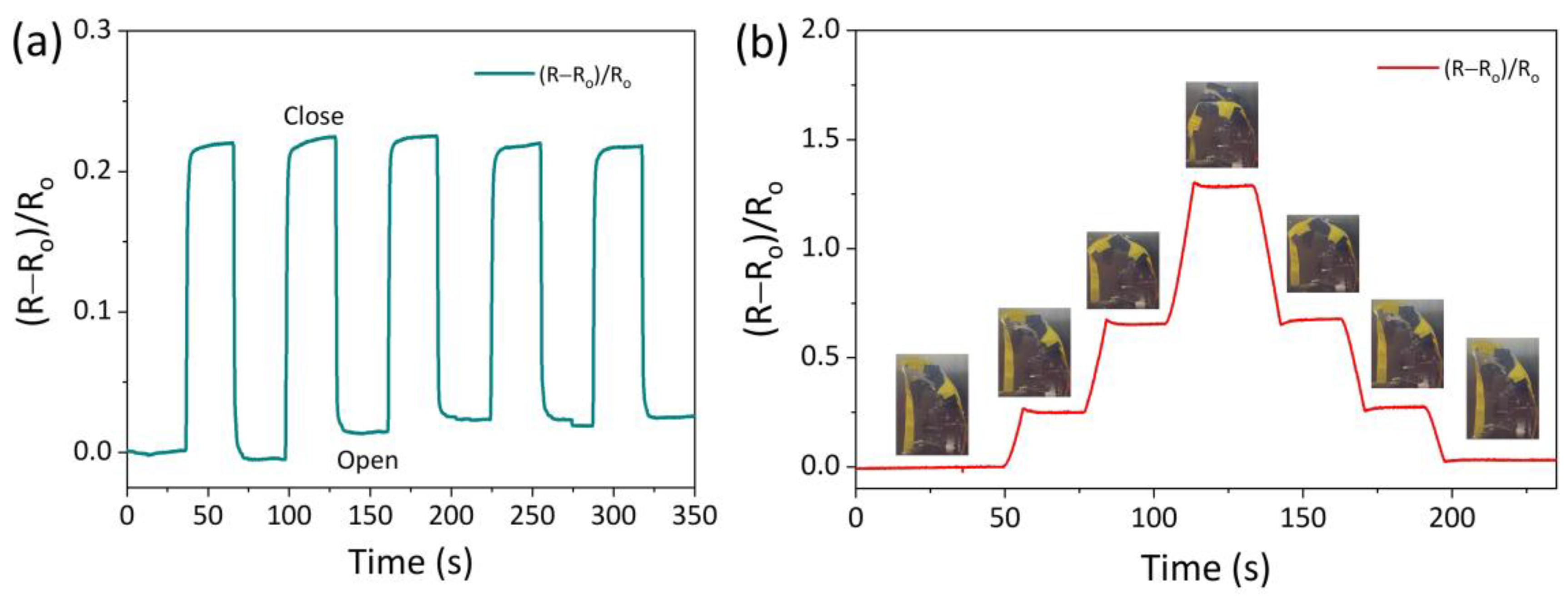 Figure 5. (a) The change in relative resistance when the AICH3-based strain sensor is fixed on the bionic finger and repeatedly bends at −20 °C, and (b) the change in relative resistance when the bending degree of the bionic finger gradually increases and then gradually recovers different bending degrees.
