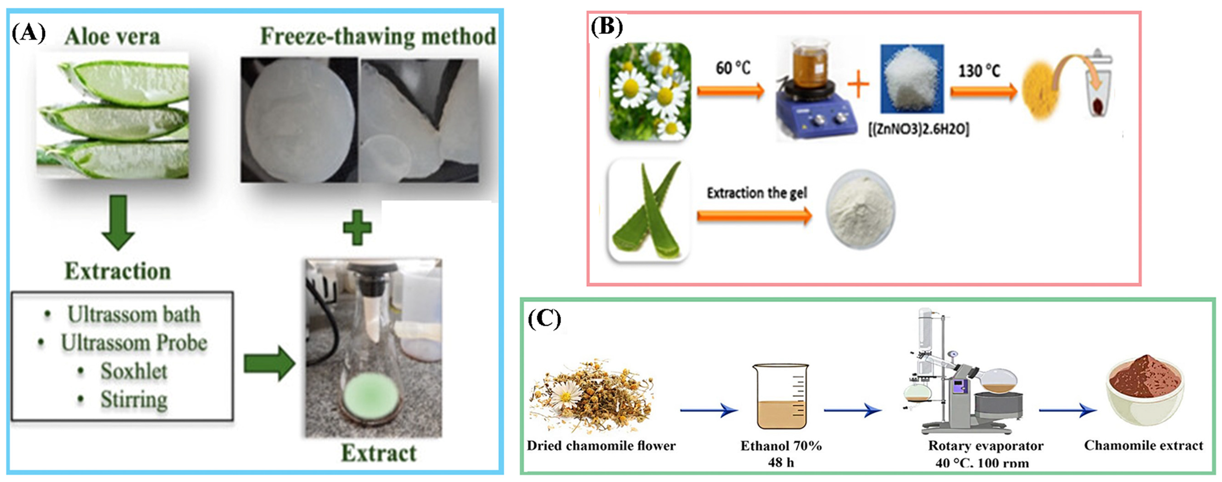 (1) Stirring and maceration uses 1 g of Aloe vera with 25% ethanol at 60 °C and 180 rpm for 1 h, followed by centrifugation (4 °C, 9000 rpm, 10 min), washing of the residue, rotary evaporation (60 °C, 370 mbar, 50 rpm) to remove ethanol, and freeze-drying for 70 h to obtain the extract [57];