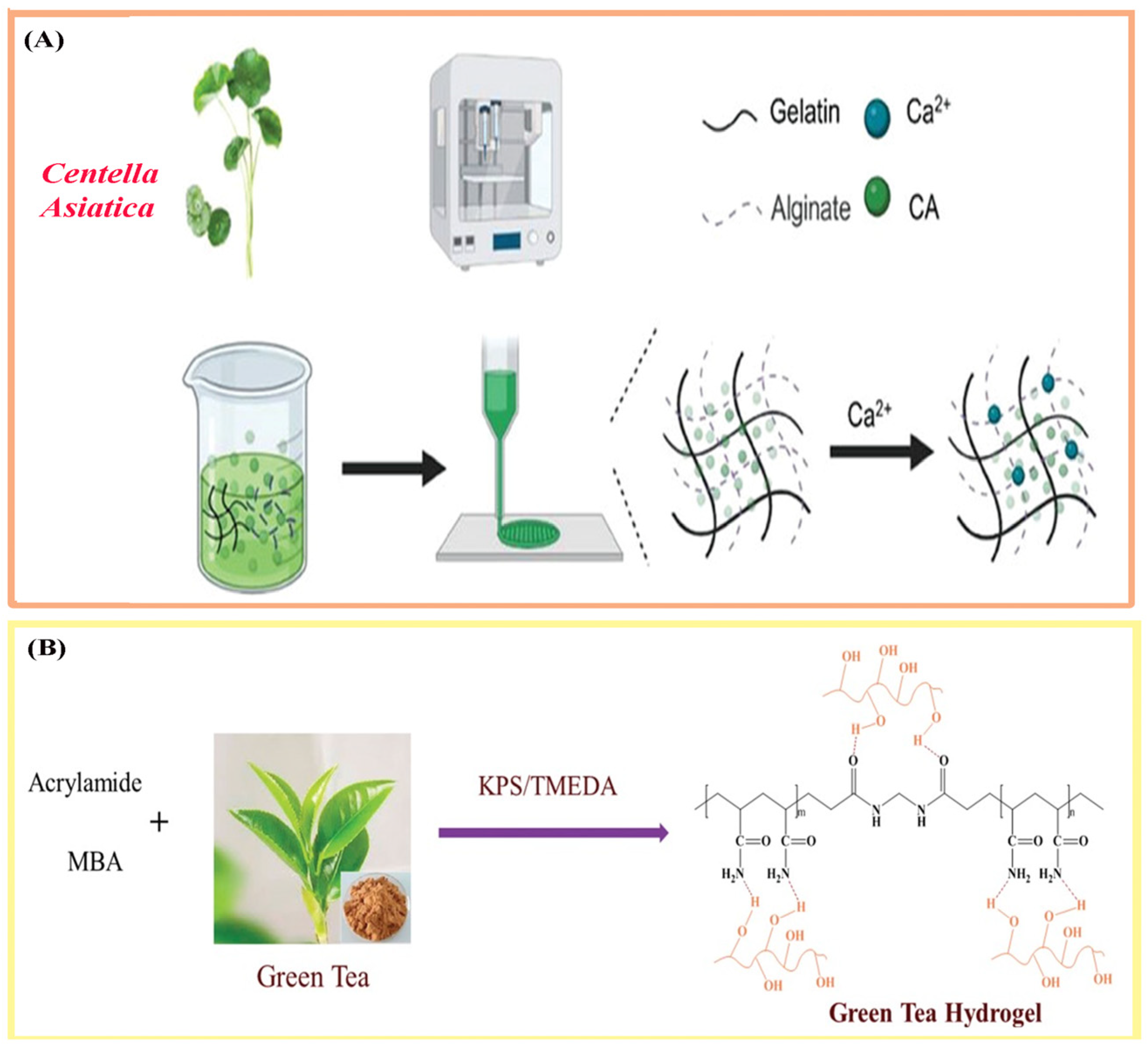 Green tea (Camellia sinensis) is rich in polyphenolic compounds, particularly catechins such as epigallocatechin-3-gallate (EGCG), which exhibit strong antioxidant [26], anti-inflammatory, antimicrobial [27], and angiogenic activities. These biological effects are primarily mediated by EGCG through inhibition of the NF-κB signaling pathway and activation of the Nrf2 antioxidant pathway [28]. Mice treated with EGCG-loaded PLGA membranes displayed increased vascularization and accelerated re-epithelialization compared with control membranes, confirming the compound’s pro-regenerative effects. Nevertheless, maintaining optimal EGCG concentration in hydrogel formulations is crucial, as excessive doses may exert cytotoxic effects [29].