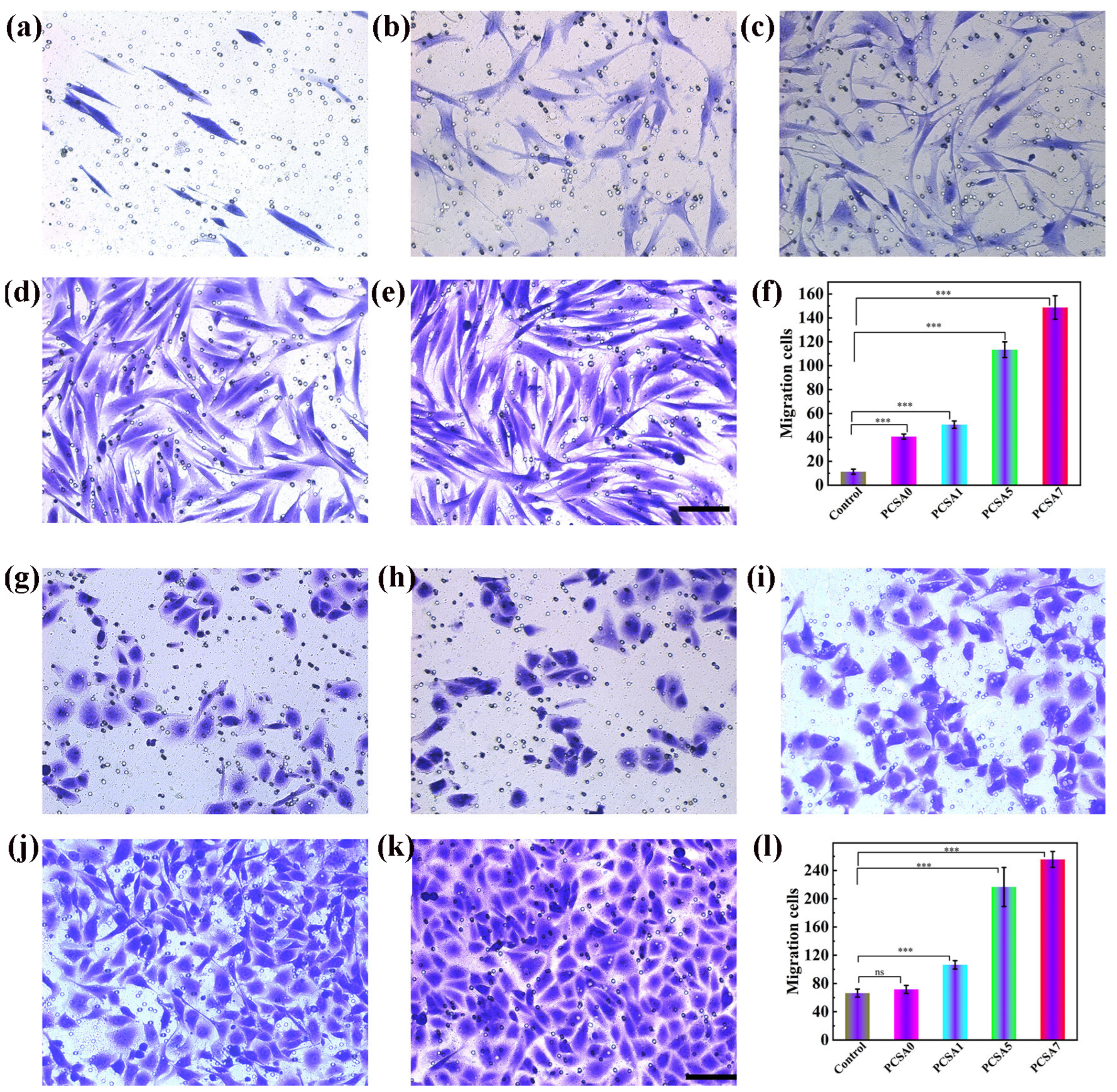 Figure 5. Curcumin-loaded into PVA-CS-SA hydrogels—in vitro fibroblasts and HUVECs cell migration; (ae) Control FBs and HUVECs. Scale bar: 150 μm; (f) Transwell migration of FBs quantified in the histogram; (gk) HUVECs treated with PCSA1, PCSA5, and PCSA7, respectively. Scale bar: 150 μm. (l) Transwell migration of HUVECs quantified in the histogram. Adapted with permission from ref. [168].