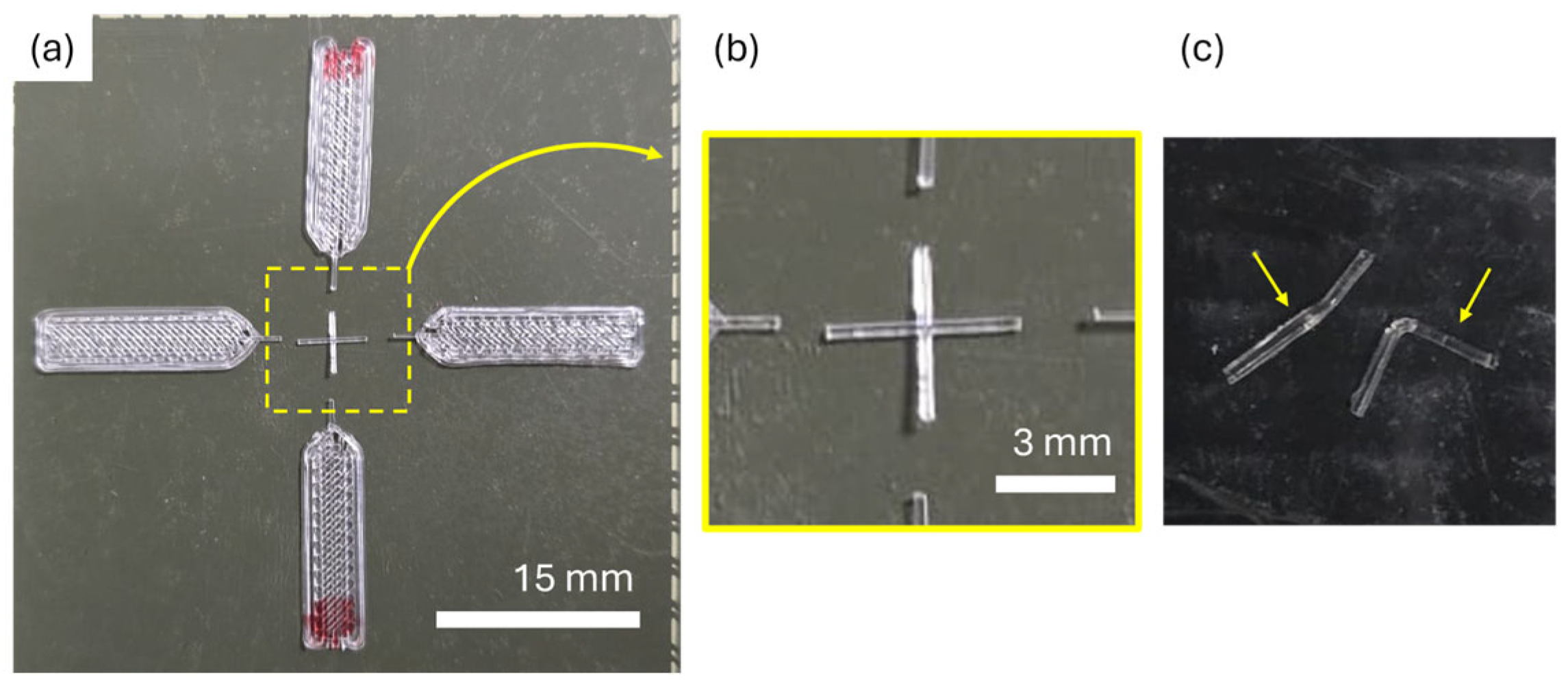 Samples were printed in runs, in which a total of six cross-shaped samples were printed per run, see Figure 4a,b. The first layer was printed directly on the bed, and the second layer was printed at a layer height increased by 0.20 mm. Printing speed was set to 35 mm/s for the filaments forming the joints. Different nozzle temperatures (NT = 180, 190, 200, 210, and 215 °C) and bed temperatures (BT = 30, 45, 60, 75, 90, 105, and 120 °C) were set. The reason for these temperatures is explained in the following subsection. Each sample was printed entirely before the following sample was printed, until all six samples per run were produced, requiring a total of nine minutes to print the six samples. After printing, all samples were marked with a red pen on the clamping area to keep track of the layer that was printed above, as shown in Figure 4c. All samples were allowed to cool down for a minimum of ten minutes on top of the bed before being manually removed with the help of a spatula. Printed samples were stored in a desiccator chamber to maintain low-humidity conditions (below 30% RH). This chamber was placed inside a dark room with no ambient light and with a controlled temperature of 22 ± 2 °C. The samples were naturally aged in these conditions for one day before testing.