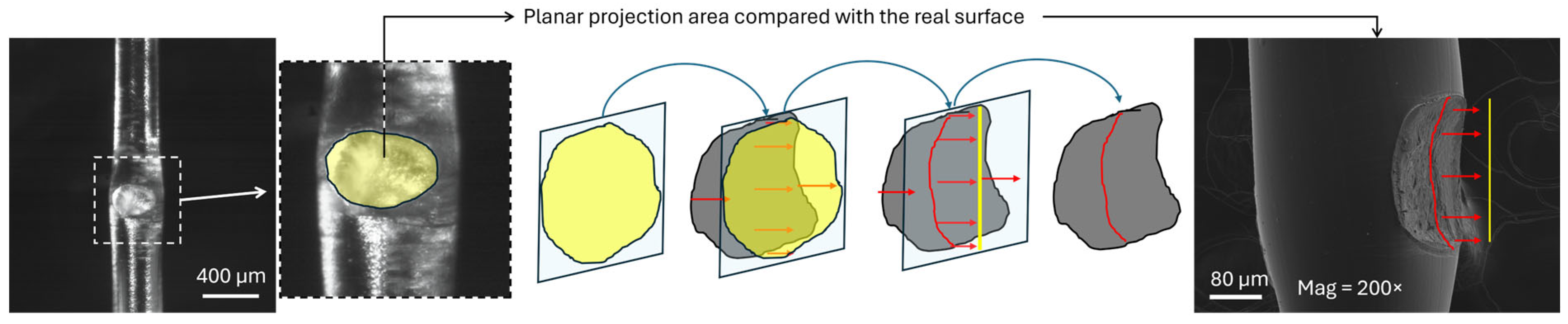 where F m a x is the maximum force obtained during the tensile test, and A P is the projected area (the planar projection of the fracture surface). This equation was only applied to the samples that failed due to joint detachment. To obtain the values of the projected area, the fracture surfaces of all samples were observed under an optical microscope at magnification 63×. A digital image was obtained from which the planar area of the fracture surface was measured using ImageJ software (Figure 7).