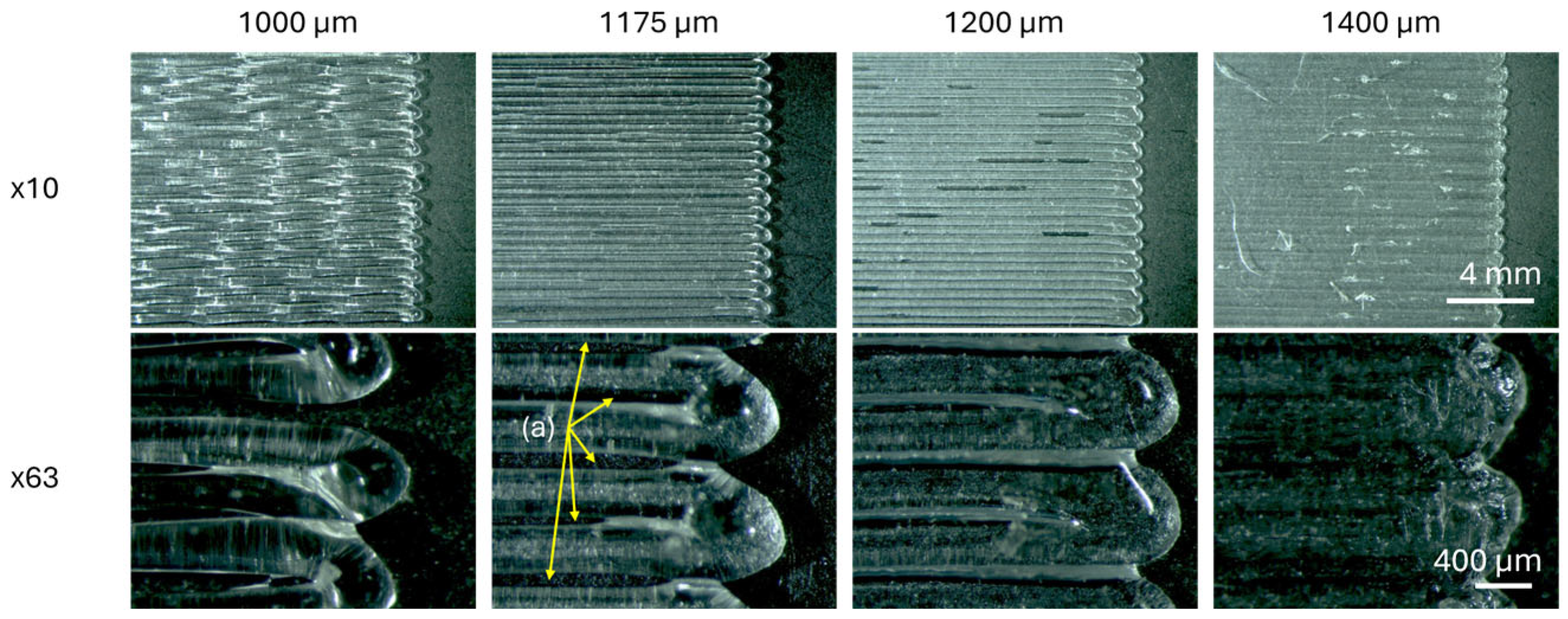 For the first-layer calibration, it is typically desired that the distance between the nozzle and the bed produces a compact first layer with minimal gaps between filaments. In Figure 8, examples of the first layers produced for different parameter z values are shown. From these images, note that a typical first layer would be printed at a parameter z of −1400 µm, as it has no gaps between the filaments.