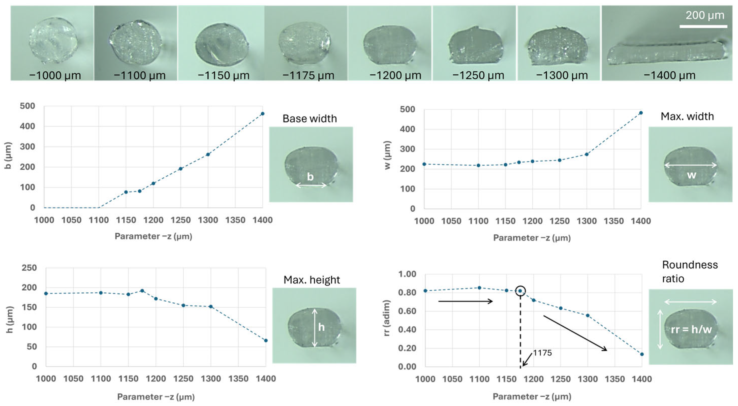 It was found that the value of −1175 µm was the optimal one for printing the samples, as the roundness ratio presented a relatively straightforward threshold, with stable values around 0.82, and a decrease after the parameter z values reached −1175 µm, as shown in Figure 9. After confirming through mechanical tests that the samples were detaching at the joint (a mandatory requirement for the design) and that this condition provided a mix of failure mechanisms (ideal for serving as a reference point), the value of −1175 µm was selected for this study. Note that each printer will have its own calibration method, and it is recommended to compare the results with the optical images of the cross-sections in Figure 9. This should help reproduce and compare results.