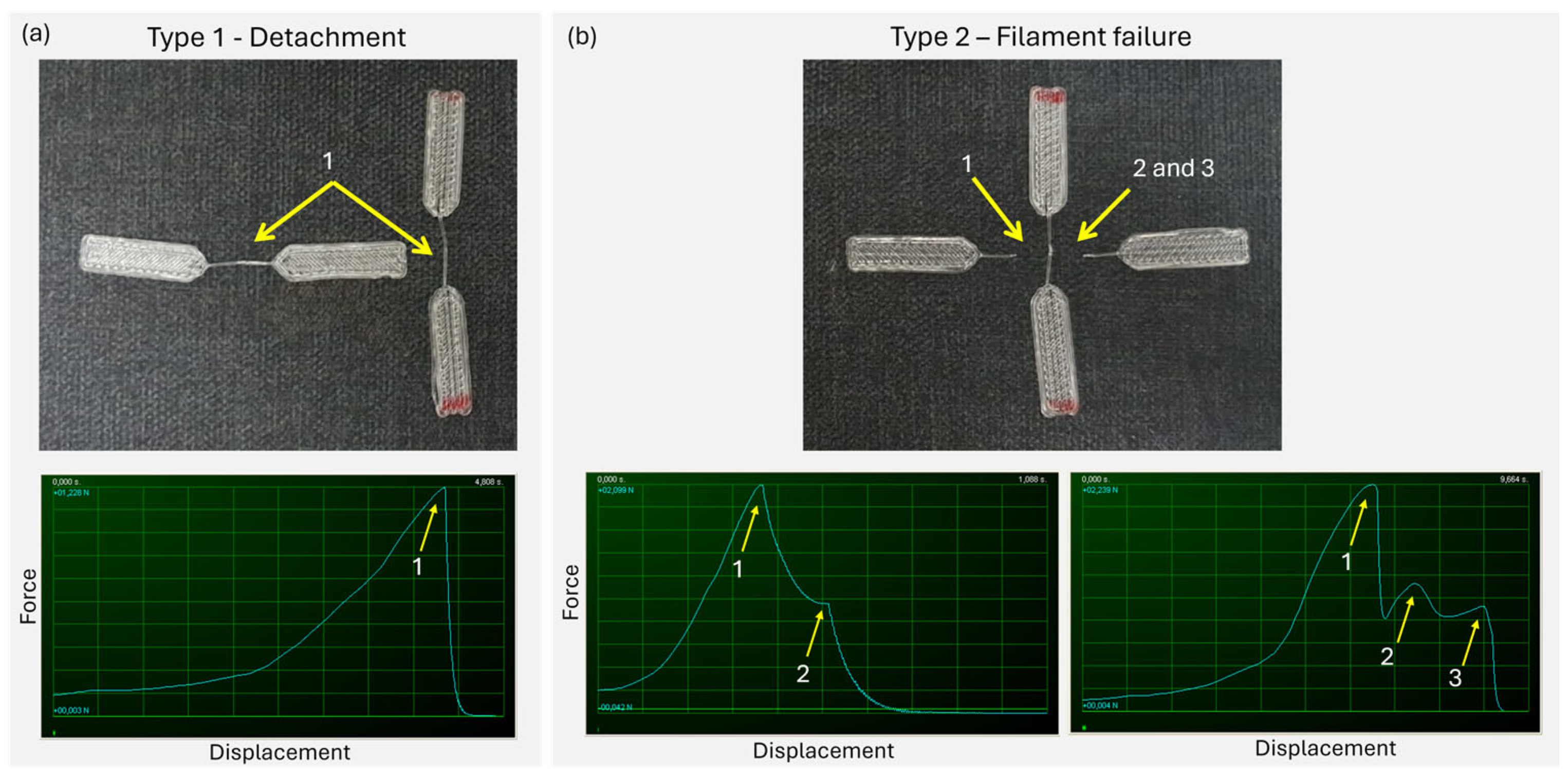 This study aims to address the gap in the literature and design experiments that provide deeper insights into the fundamental mechanisms governing interlayer adhesion. It will help inform the development of more robust additive manufacturing processes, as previously achieved in our group’s study of 1-D filaments [42,43,44,45], and provide new data for machine learning algorithms [42]. For this purpose, a cross-shaped or cruciform sample has been designed with two PLA filaments joined or welded at a single point. They have been printed using an FDM process, and the influence of two key processing parameters (the nozzle temperature and the bed temperature) has been evaluated. This study presents a discussion on the various approaches for testing a single PLA–PLA joint (adhesive clamping vs. mechanical clamping), evaluates their respective advantages and limitations, and proposes a novel experimental methodology to characterize the adhesion between two individual PLA filaments fabricated by FDM. Particular attention is devoted to the practical challenges of this type of testing, notably the difficulty of applying tensile loads exclusively through the top and bottom surfaces of the joint, as well as the curvature of the fracture surface and the complex state of stress. These limitations, and their potential impact on the interpretation of the results, are carefully examined to provide a critical and transparent assessment of the proposed method’s validity and reliability.