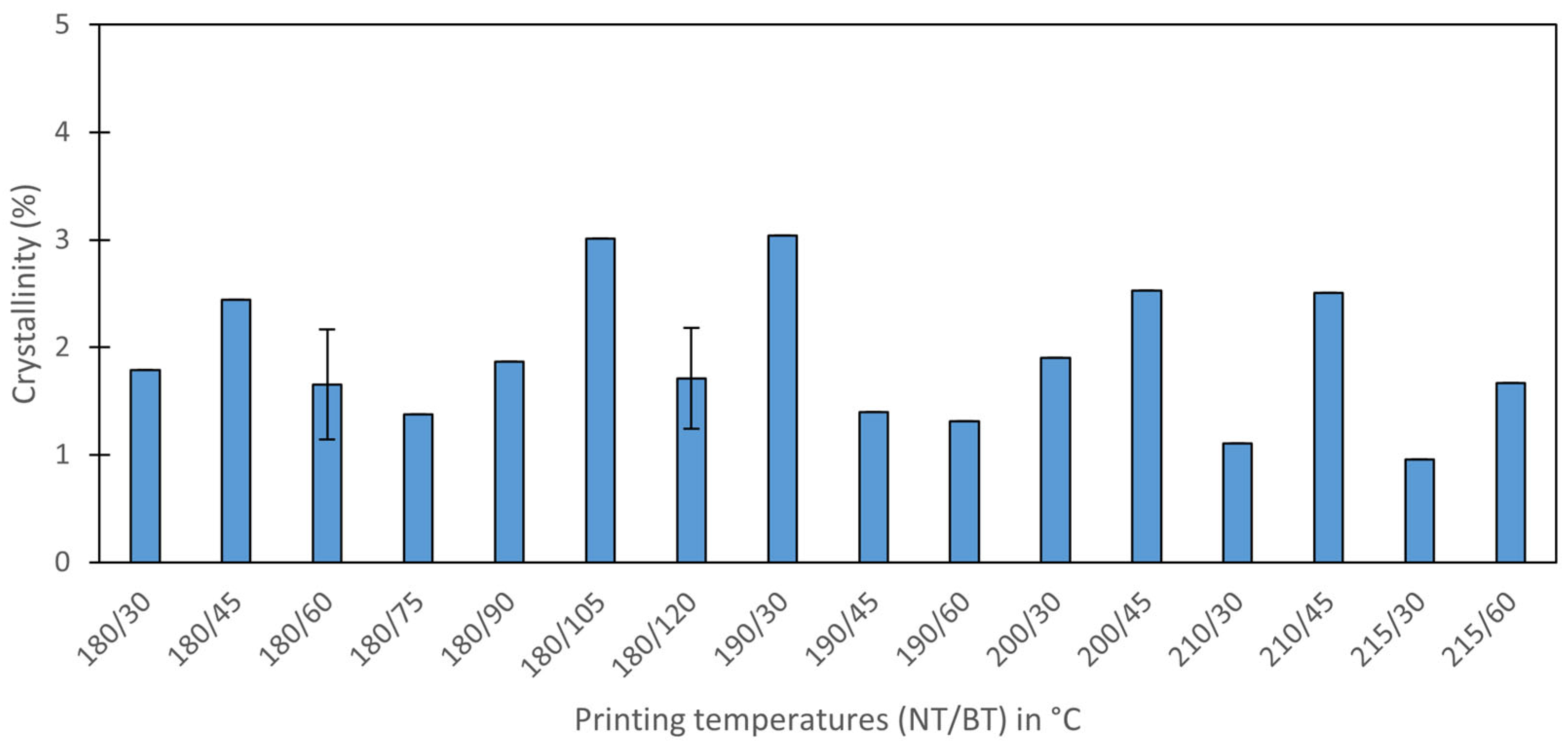 Nozzle Temperature (°C)Nominal Bed Temperature (°C)Ageing Time (Days)PositionSamples Tested (n)Crystallinity (%)