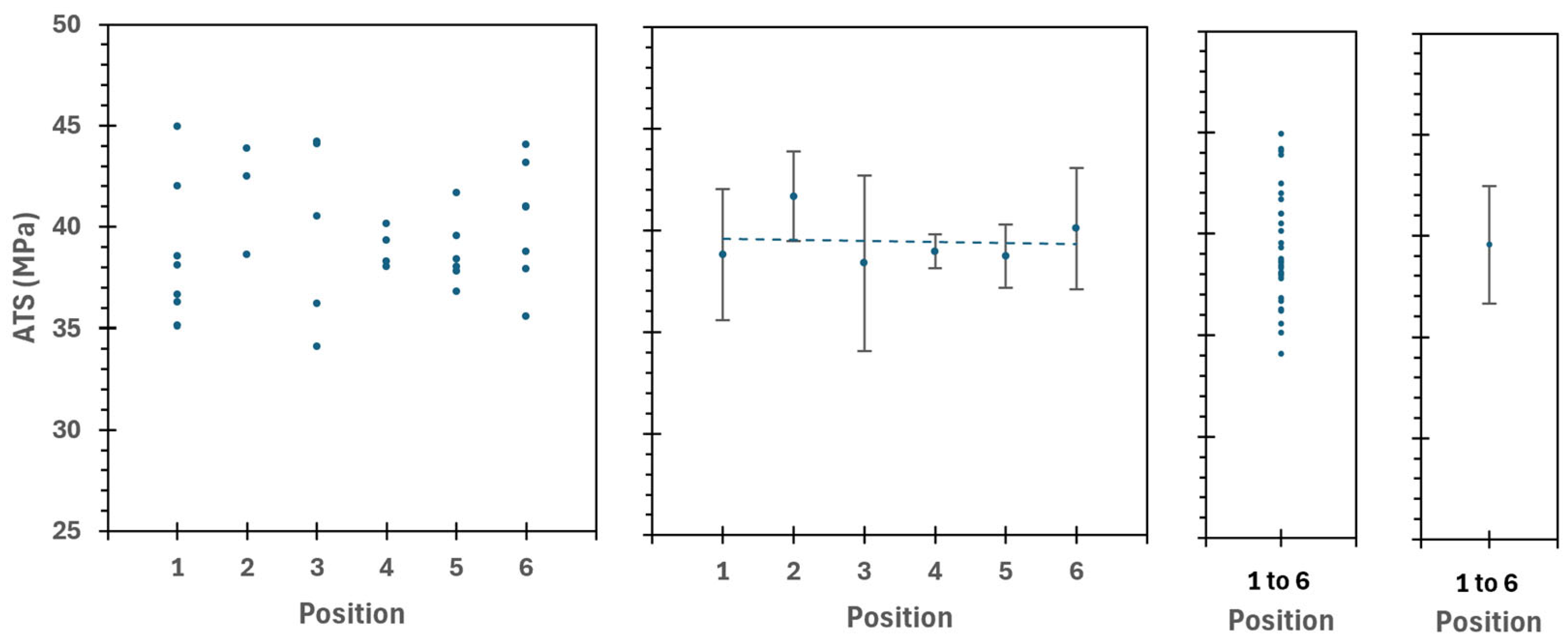 A minimum of n = 12 samples were tested for each combination of printing temperatures (NT and BT) using the horizontal mechanical clamping method. Special attention was given to the combination of NT = 180 °C with BT = 60 °C, where a total of n = 60 tests were performed to evaluate the effect of the printing position (positions 1 to 6) on the bed and assess the reproducibility of the designs.