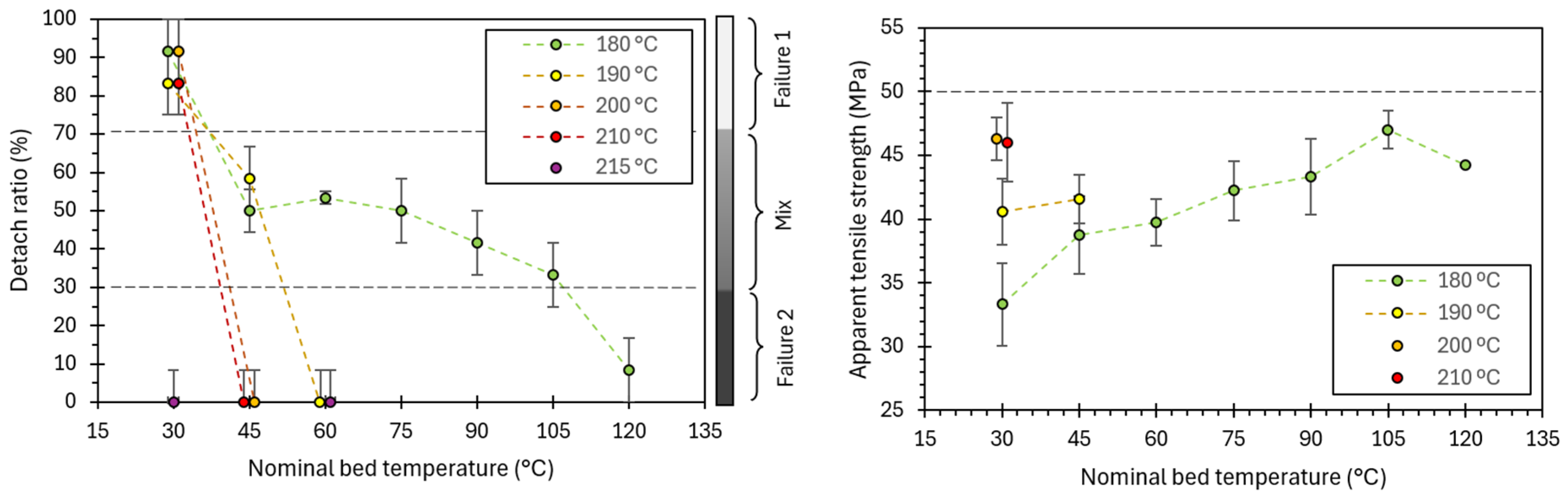 Table 5. Additional tests were conducted on samples that had naturally aged for 14 days at all printing temperatures. The error for the detach ratio was assumed to be ±1 detached sample. Error of the apparent tensile strength is calculated as the standard deviation.