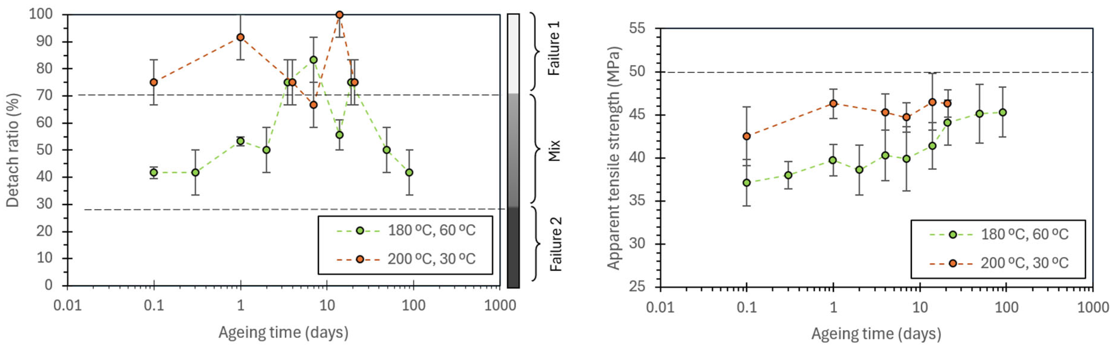 Table 4. Test of samples naturally aged for printing temperatures of 180 °C/60 °C and 200 °C/30 °C. The error for the detach ratio was assumed to be ±1 detached sample. Error of the apparent tensile strength is calculated as the standard deviation.