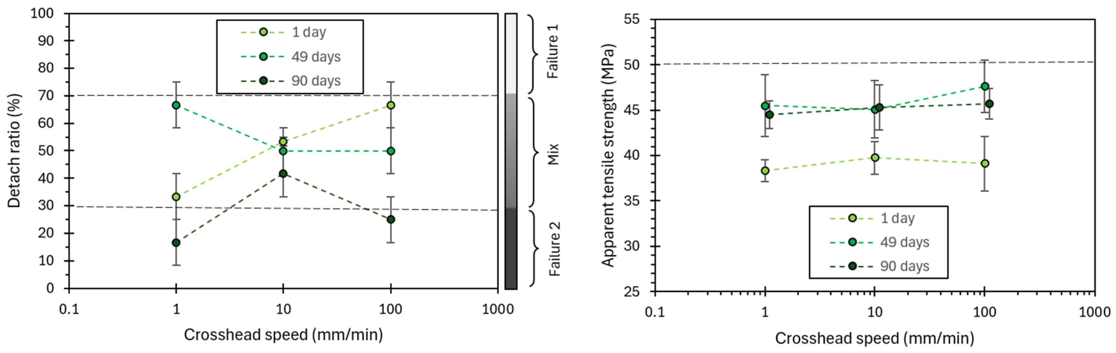 Figure 23. Effect of crosshead speed (mm/min) on the detach ratio and apparent tensile strength. Colors are just to help the visualization of the different conditions. Dashed lines are solely used for improving data visualization by directly joining the points.