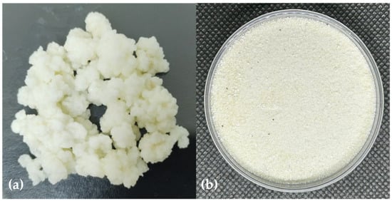 (a) Milk kefir grains; (b) kefiran, appearing as a pale cream-colored powder, obtained by fermentation.