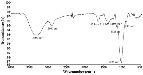 The most intense band at 3309 cm−1 corresponds to O–H stretching, indicating mainly the presence of hydroxyl groups in kefiran and, to a lesser extent, water adsorbed by the polymer [,,]. At 2900 cm−1, the C–H stretching of methyl (−CH3) and methylene (−CH2−) groups is observed [,], typical groups in polysaccharides []. The signal at 1625 cm−1 is associated with the H–O–H bending of water bound in the exopolysaccharide [,]. The bands in the 1420–1250 cm−1 region can be attributed to C–H and O–H groups []. Intense absorptions were recorded at 1125 cm−1 and 1025 cm−1, characteristic of C–O–C bonds, which are fundamental in carbohydrate structures [,]. Finally, the signal at 880 cm−1 corresponds to β-glycosidic bond vibrations, indicating the presence of a monosaccharide backbone, typically glucose and galactose, within the structure of kefiran, confirming that the obtained compound is a polysaccharide []. Overall, the FT-IR spectrum evidences a material composed mainly of carbohydrates with glycosidic bonds and hydroxyl groups, suitable as a base material for film development [].