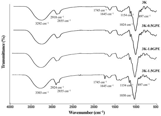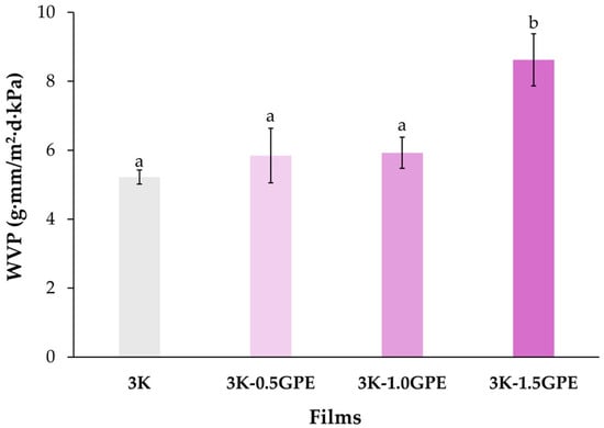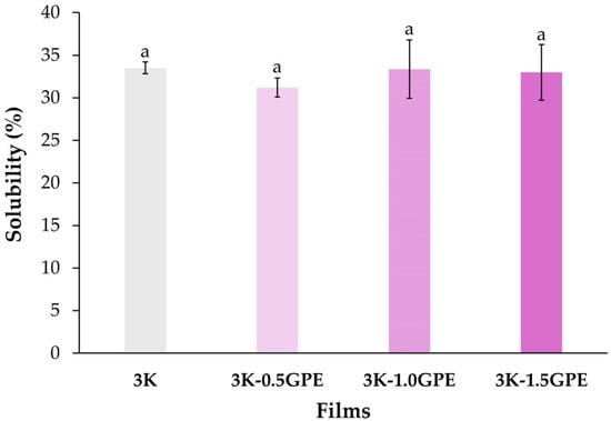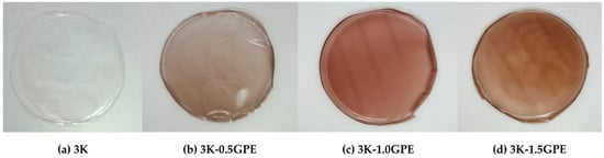 Figure 3 shows the films obtained from kefiran (3K) and with the addition of grape pomace extract at different concentrations (0.5, 1.0, and 1.5% w/v). The films obtained were homogeneous, flexible, and elastic, with a smooth surface and slight gloss. The control (3K) was colorless and transparent, whereas in the formulations containing the extract, the intensity of reddish tones and the opacity increased with the GPE concentration. Similar results have been reported in chitosan nanocomposite films incorporating cellulose nanocrystals and GPE [] and arrowroot starch films incorporated with GPE [].